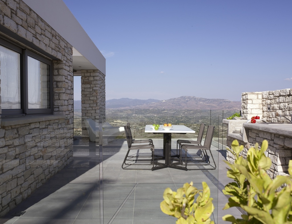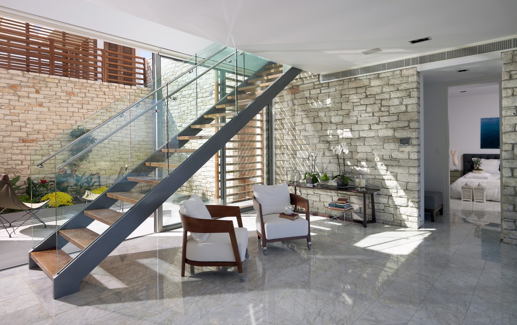 Two other large bedroom suites with full ensuite bathrooms are located farther down the glass and wood staircase. These suites have enormous patio doors that open to the outdoor verandas. Each side of the secondary living space, which divides the two bedrooms and extends from the courtyard to the pool area, is open to provide the best possible indoor/outdoor Mediterranean living.