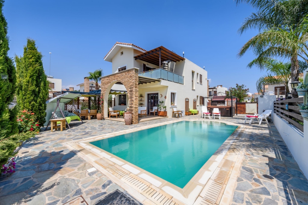 This 4 bedroom seaside villa with private pool is surrounded with views across  the sea.  Located in a gated seafront development, the villa is only 120 metres from the sea easily accessing Ayia Napa & Protaras tourist areas, the new marina. Exquisitely finished with granite counter tops, marble stairs and luxury appliances. One bedroom/office and full bath are on the ground floor while upstairs...