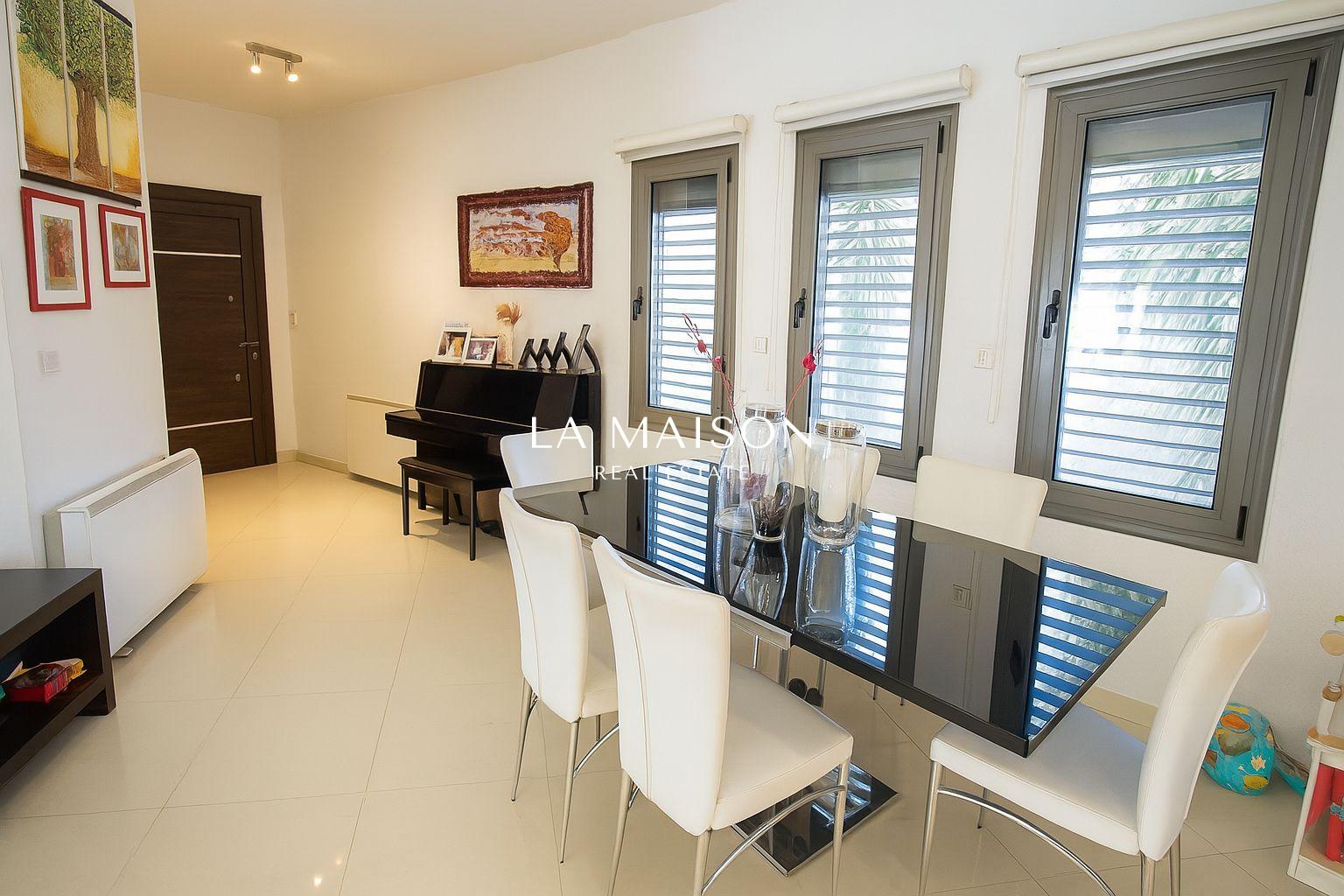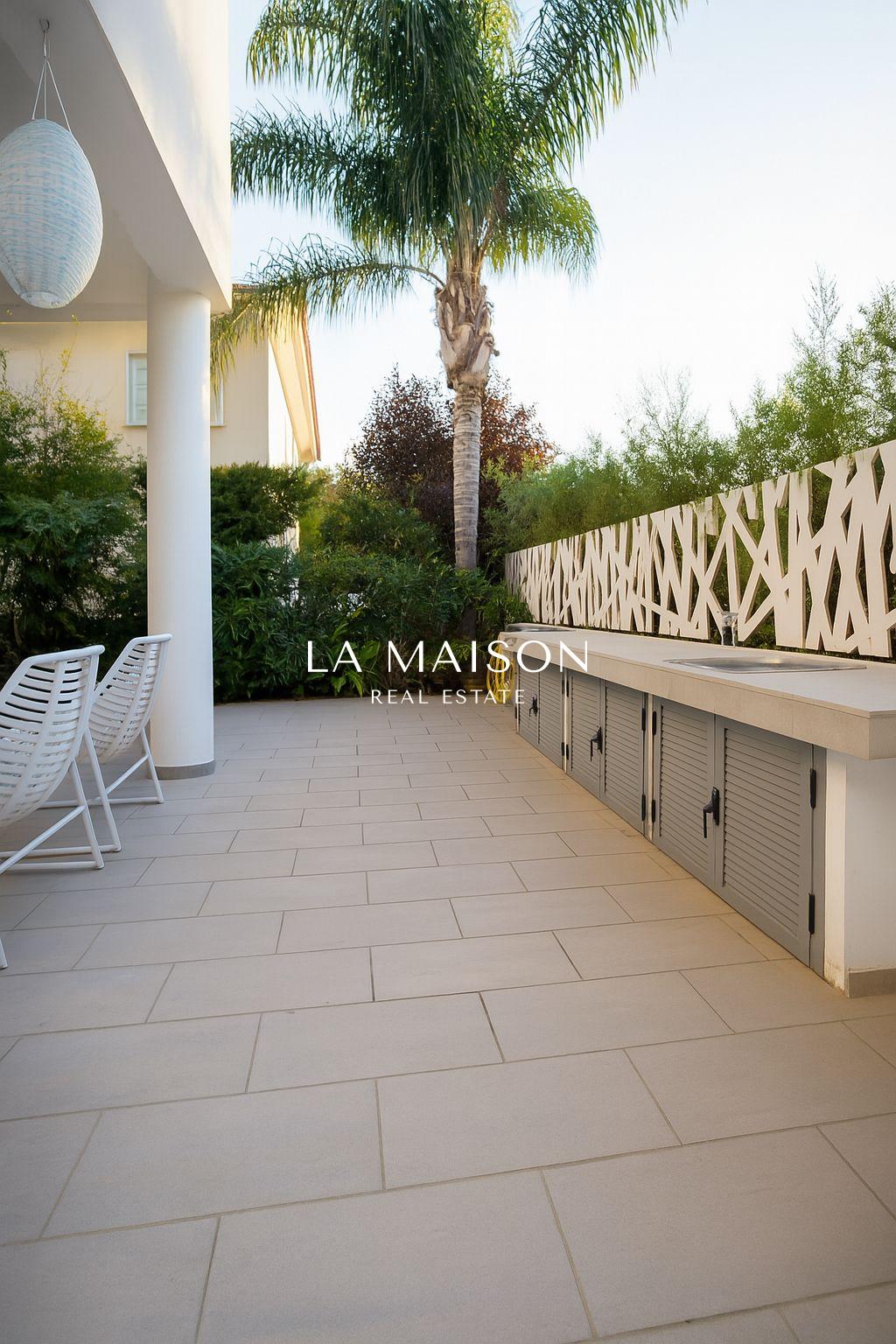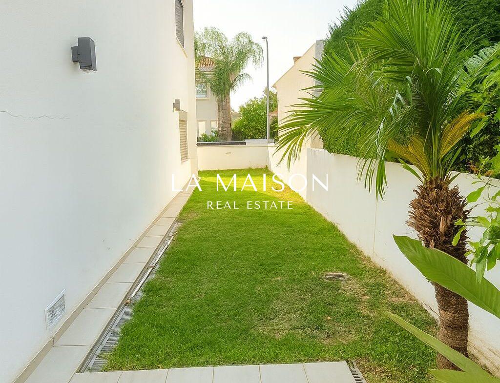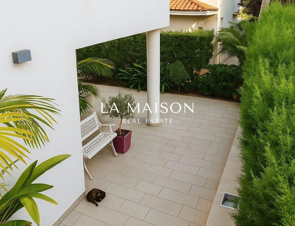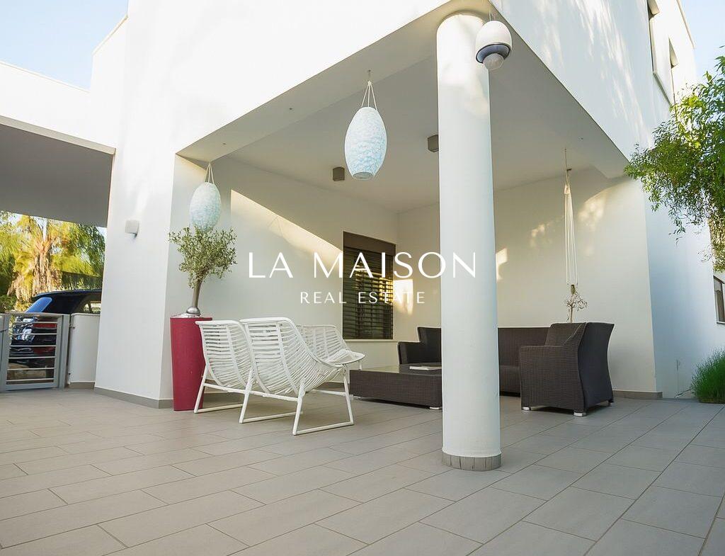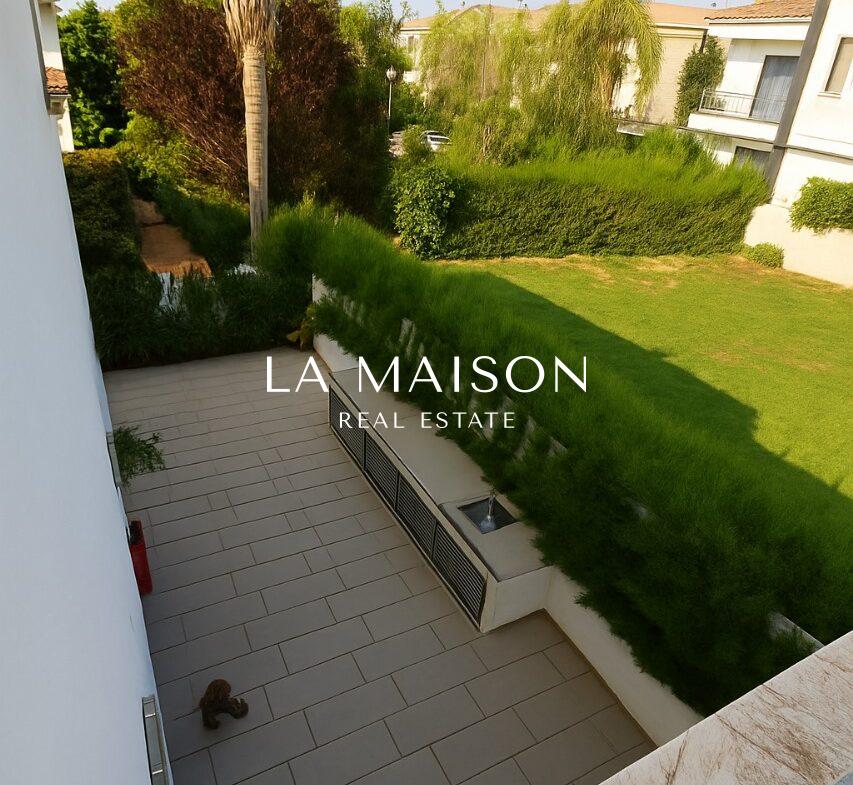 A modern two-storey four-bedroom house in Strovolos, built on a corner plot of 350m², next to a green area and a park with children’s playground and lush greenery. The property offers 240m² of living space and is designed with quality materials, featuring double walls with polystyrene insulation for better energy efficiency. A mature garden surrounds the house, providing a cozy covered terrace at the back, perfect for relaxation and outdoor dining.