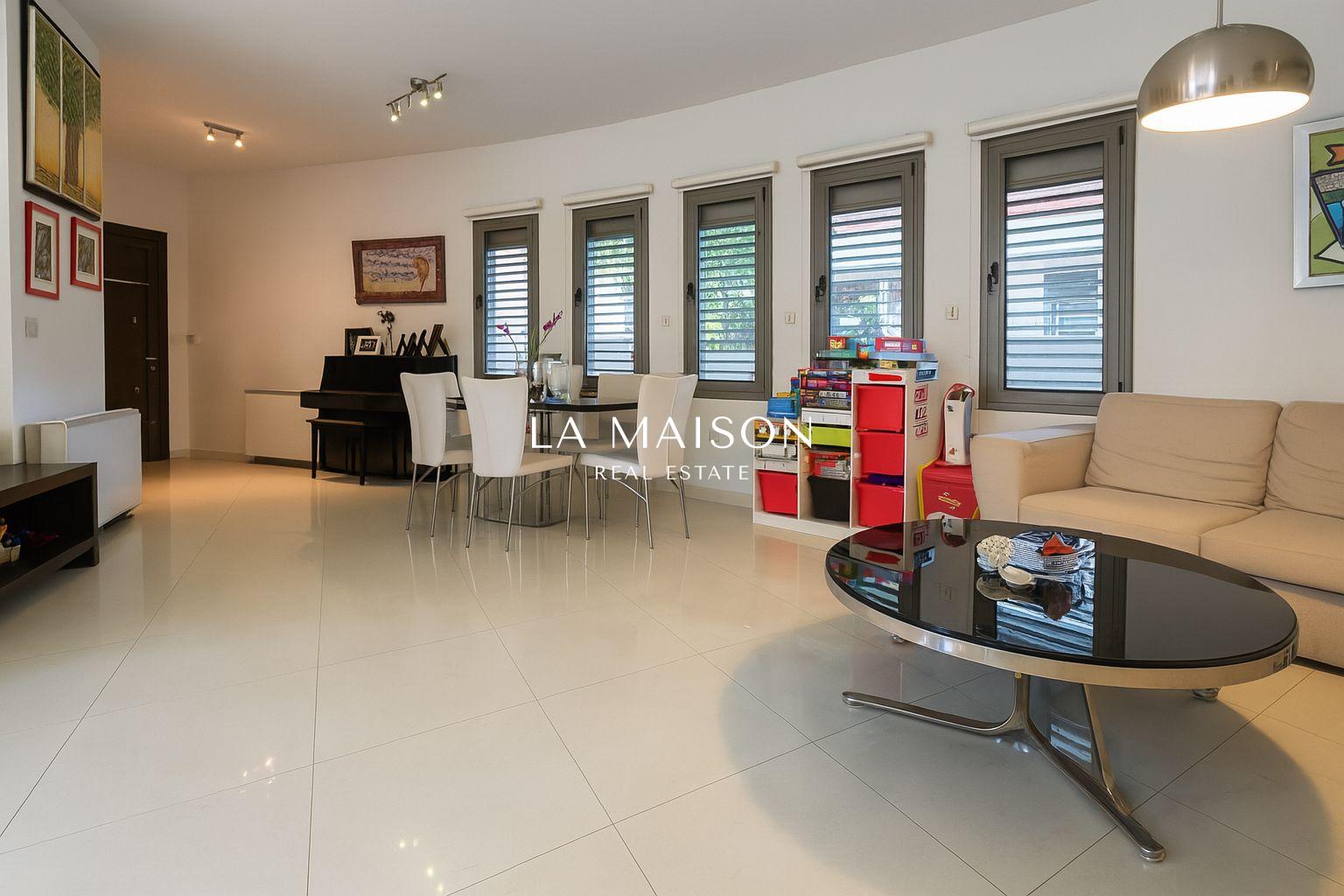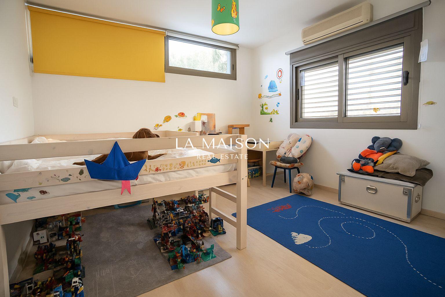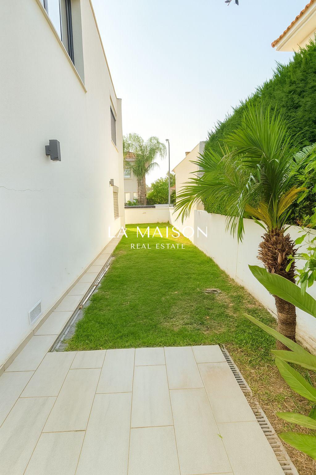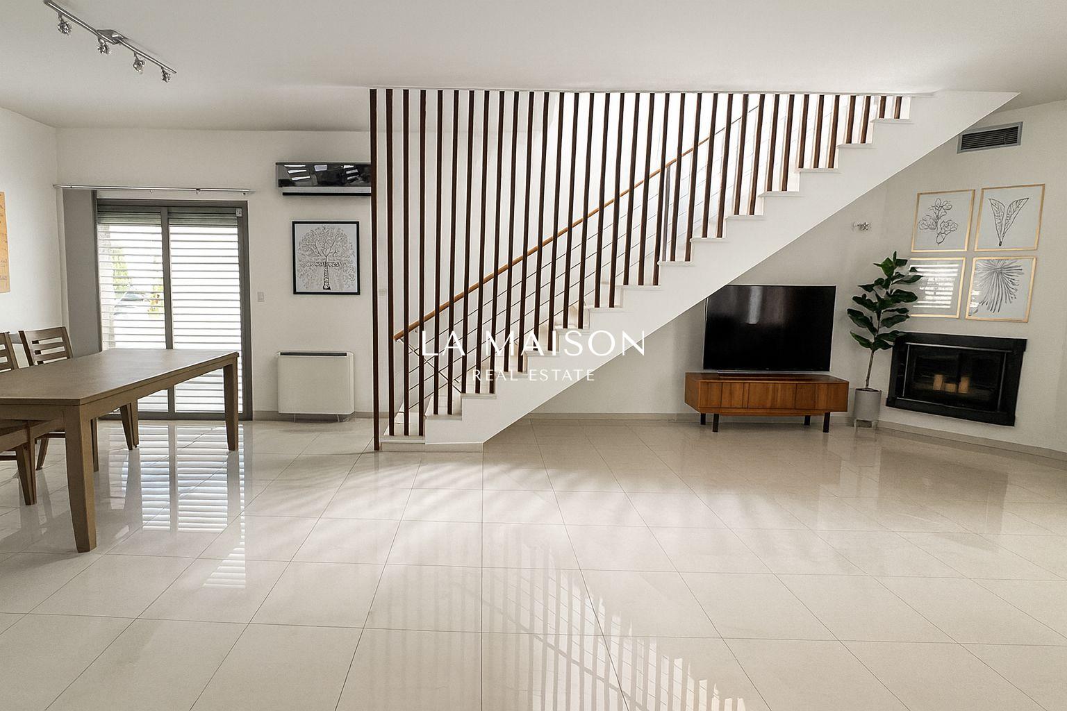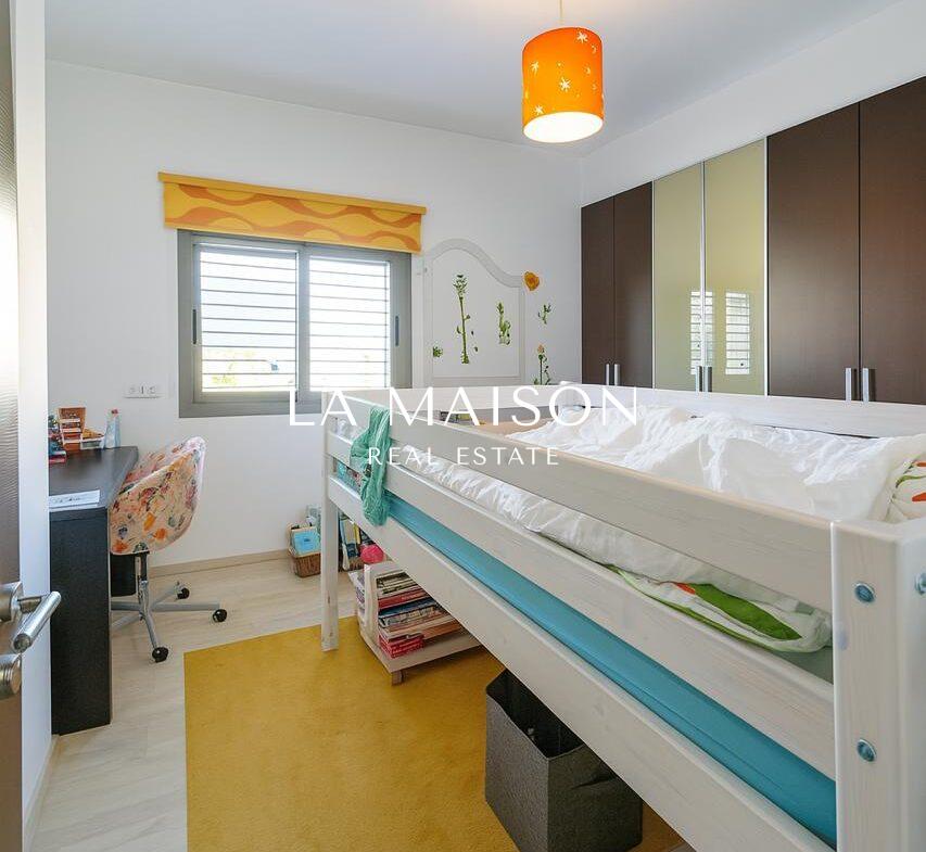 A modern two-storey four-bedroom house in Strovolos, built on a corner plot of 350m², next to a green area and a park with children’s playground and lush greenery. The property offers 240m² of living space and is designed with quality materials, featuring double walls with polystyrene insulation for better energy efficiency. A mature garden surrounds the house, providing a cozy covered terrace at the back, perfect for relaxation and outdoor dining.