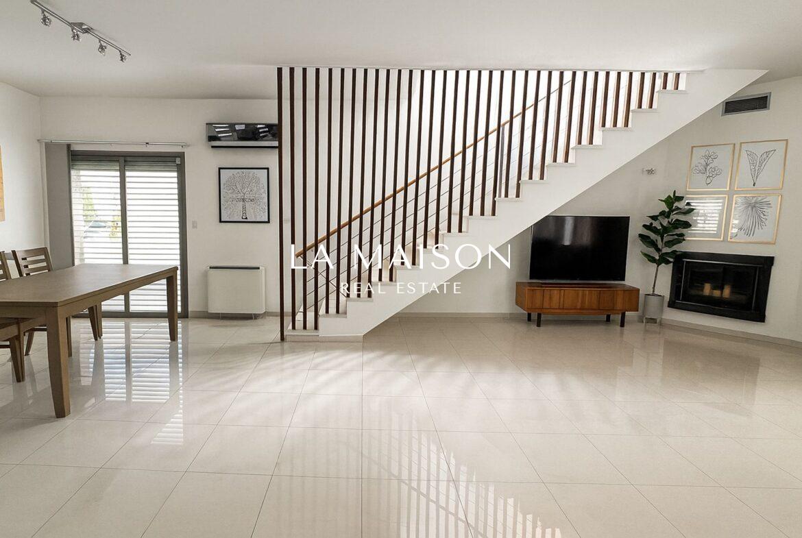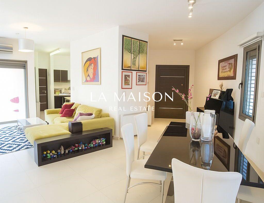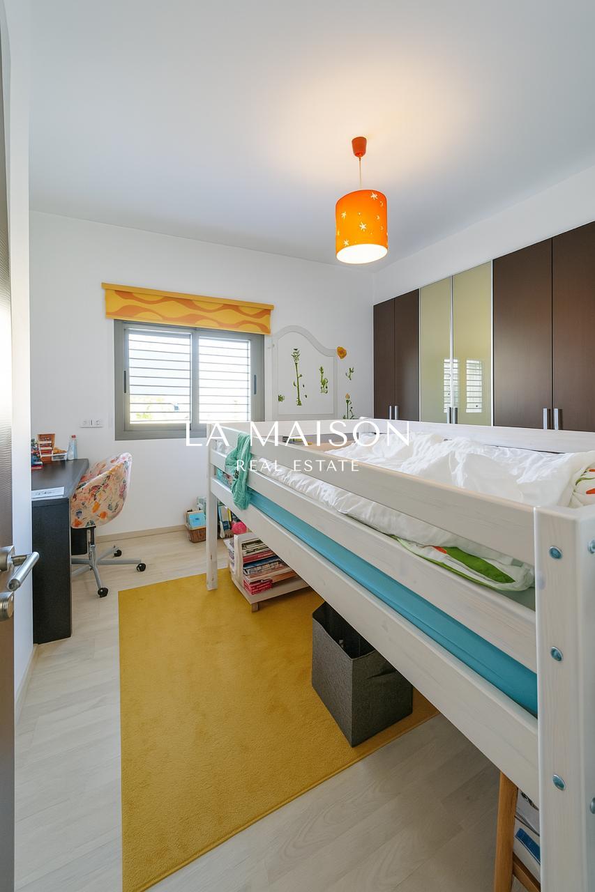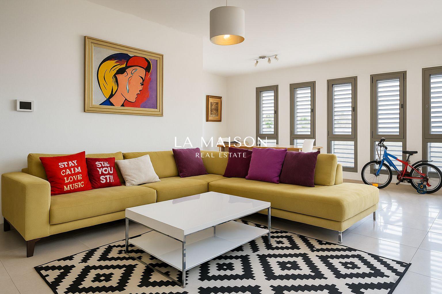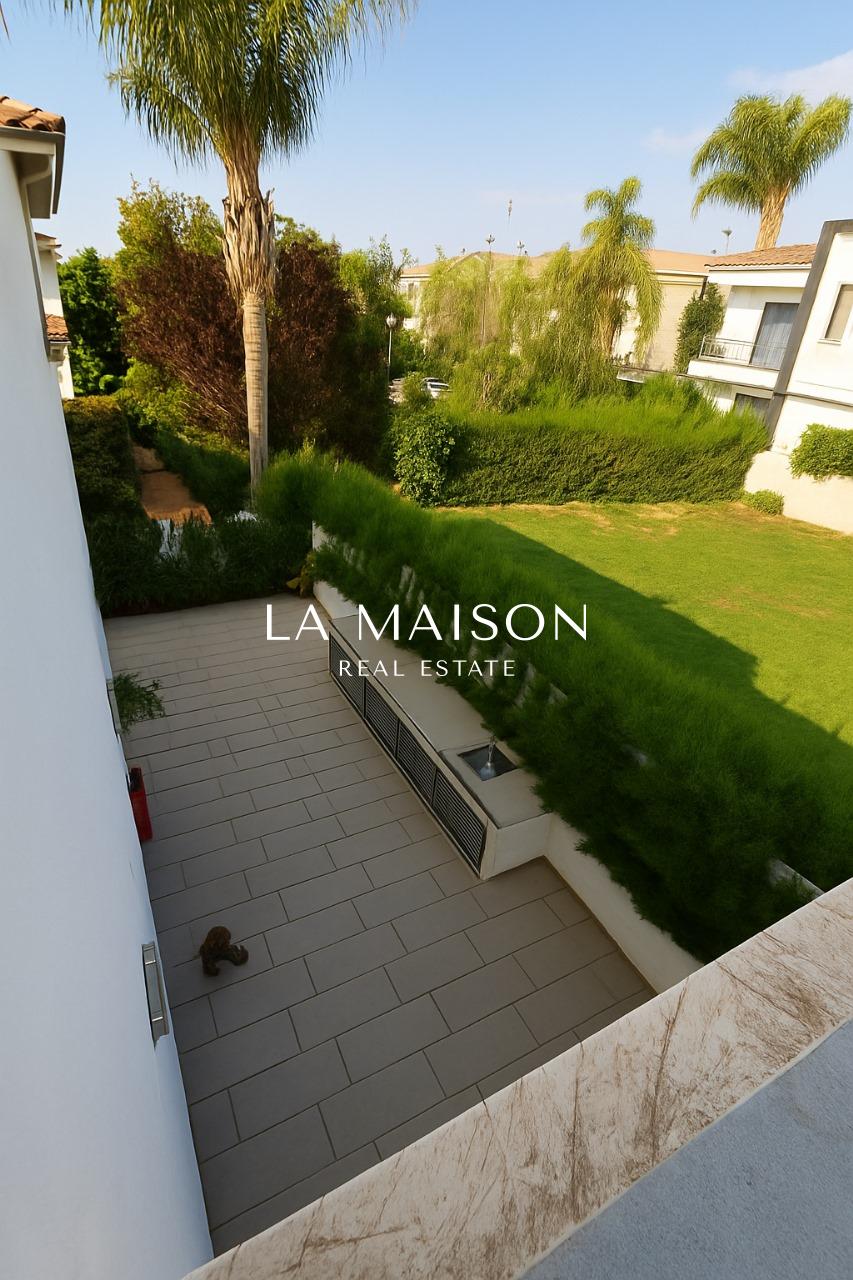 A modern two-storey four-bedroom house in Strovolos, built on a corner plot of 350m², next to a green area and a park with children’s playground and lush greenery. The property offers 240m² of living space and is designed with quality materials, featuring double walls with polystyrene insulation for better energy efficiency. A mature garden surrounds the house, providing a cozy covered terrace at the back, perfect for relaxation and outdoor dining.