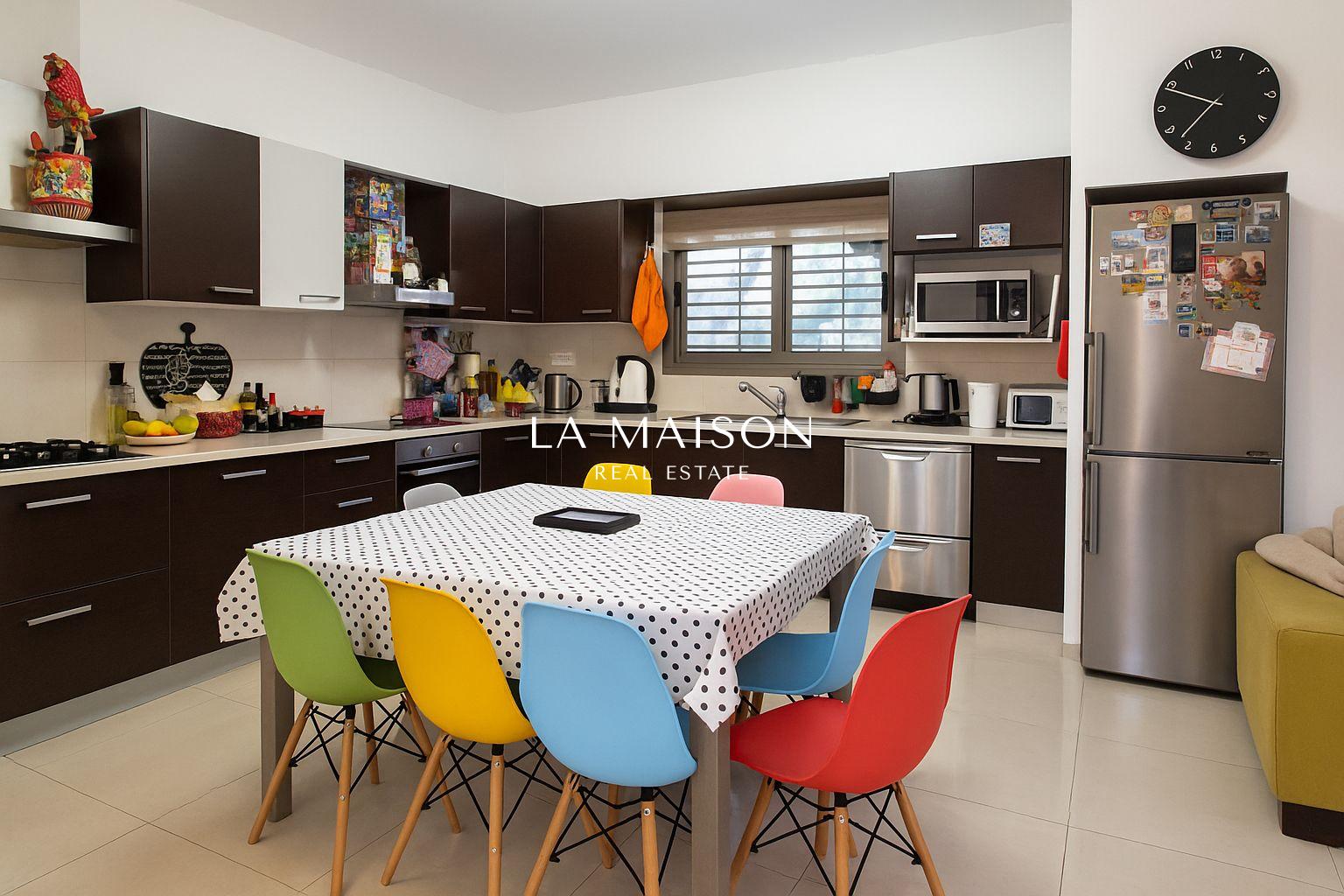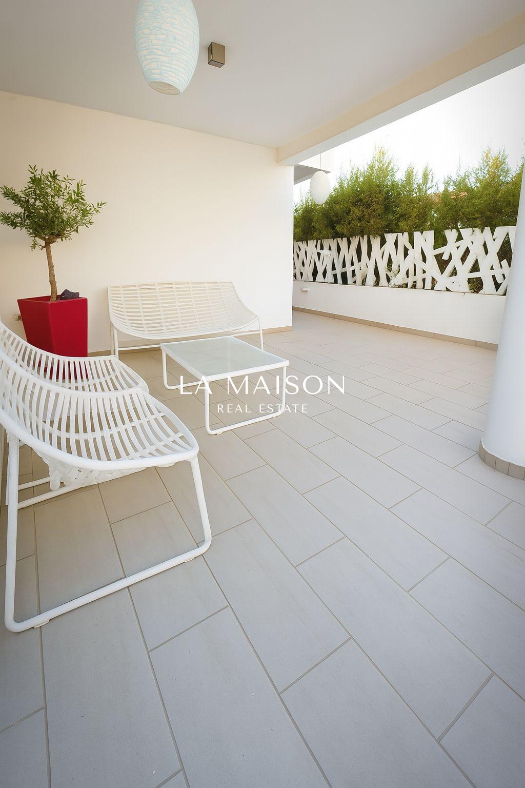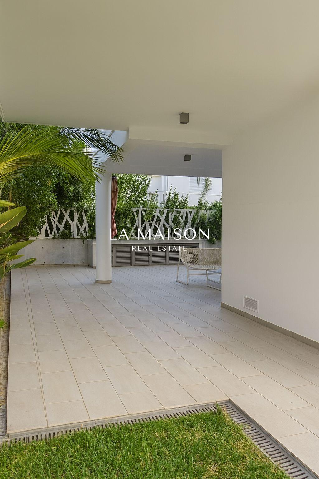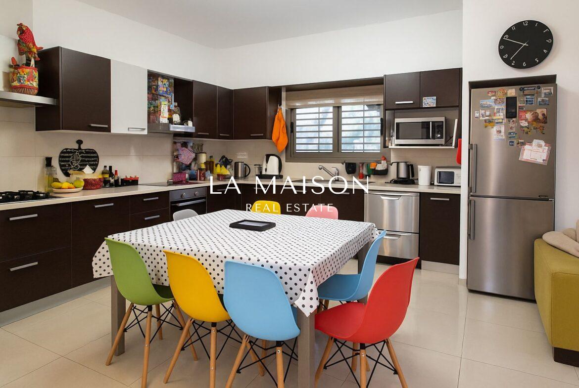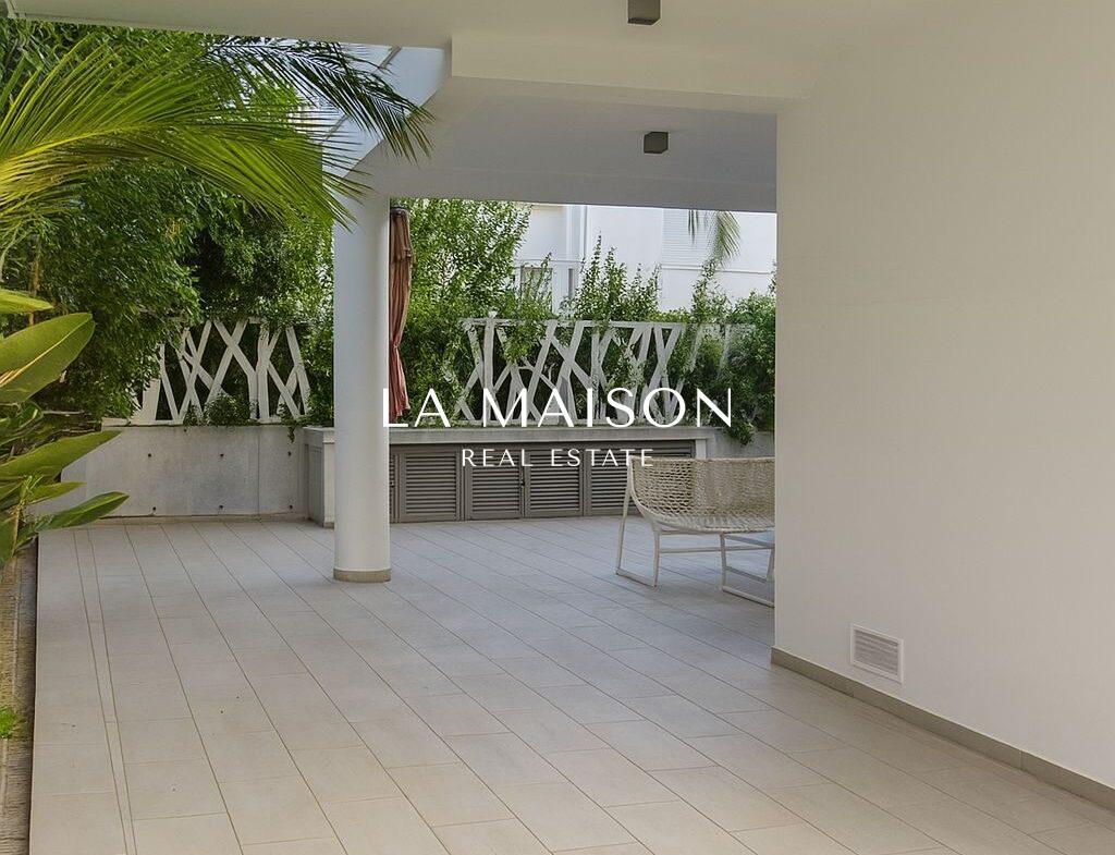 A modern two-storey four-bedroom house in Strovolos, built on a corner plot of 350m², next to a green area and a park with children’s playground and lush greenery. The property offers 240m² of living space and is designed with quality materials, featuring double walls with polystyrene insulation for better energy efficiency. A mature garden surrounds the house, providing a cozy covered terrace at the back, perfect for relaxation and outdoor dining.