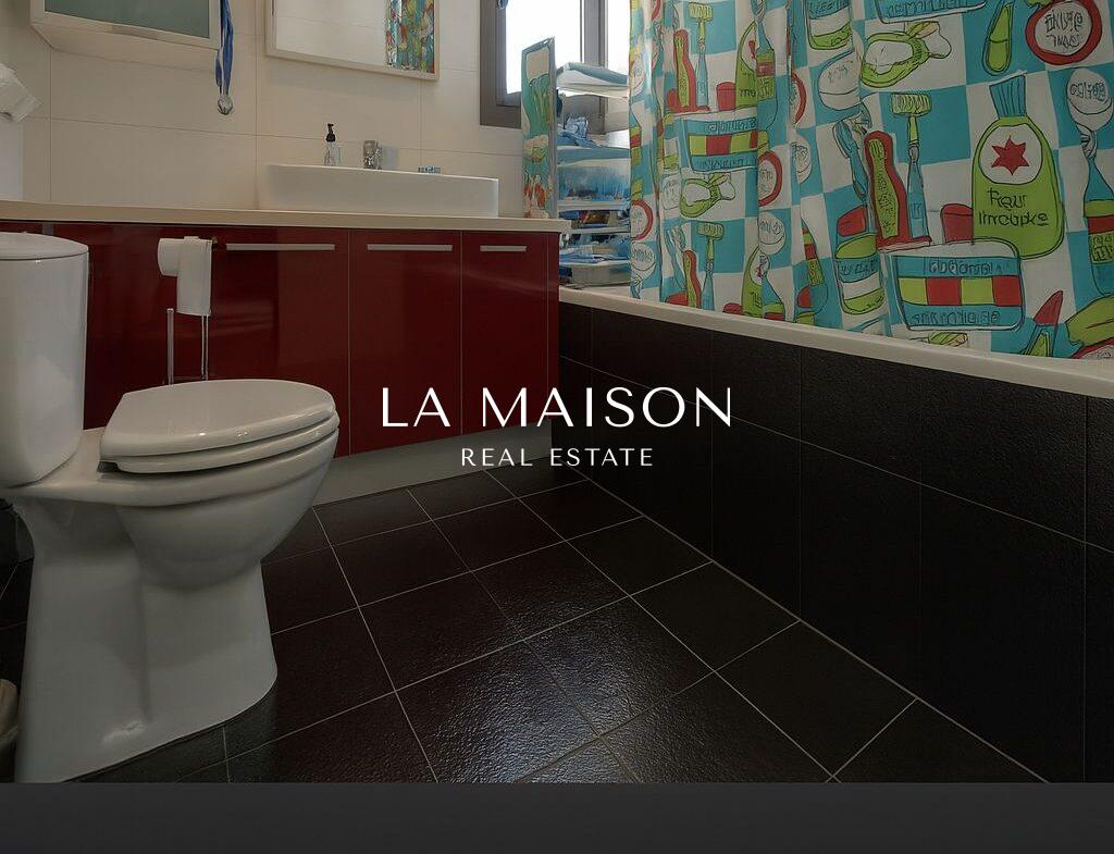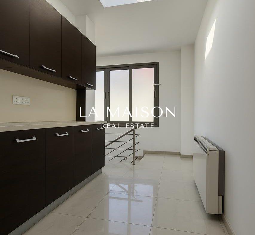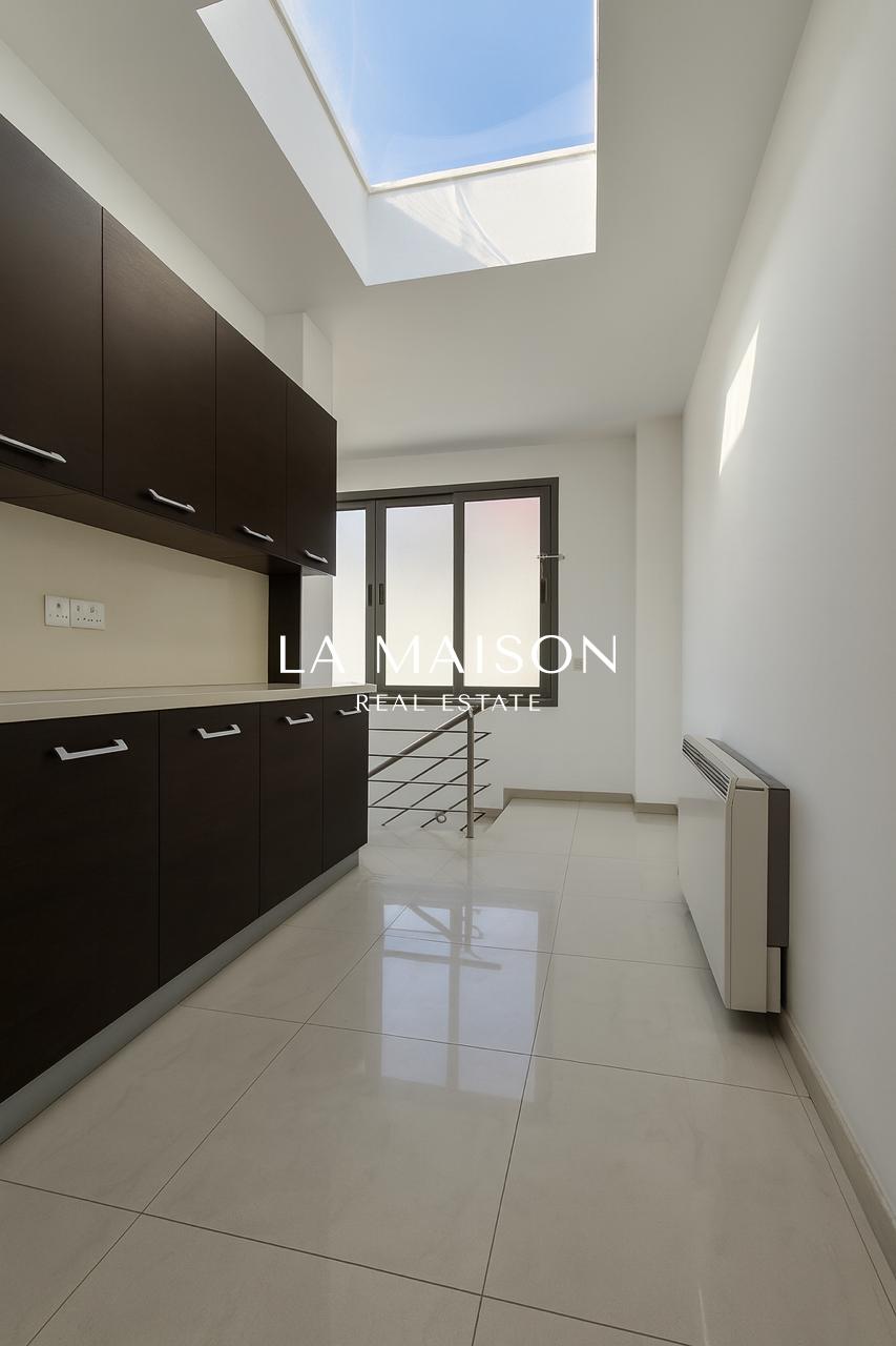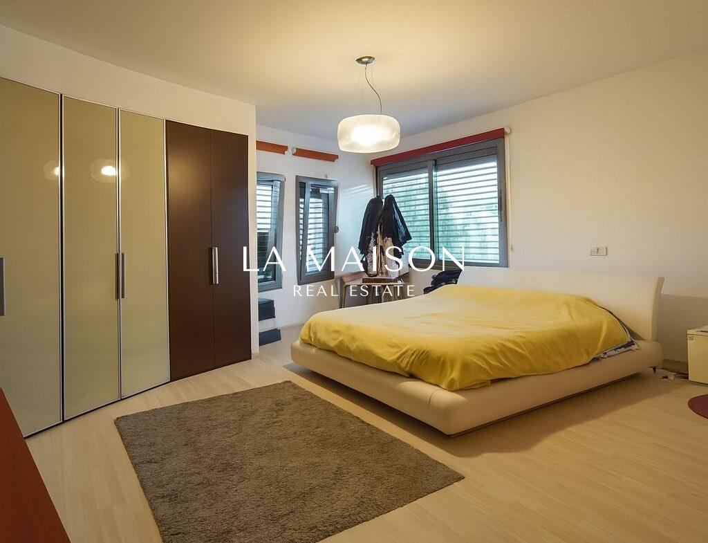 On the upper floor, there are four bedrooms with Italian wardrobes and a separate laundry room with built-in cupboards. The master bedroom includes an en-suite bathroom, while the fourth room can serve as a home office and has large sliding wardrobes and a balcony. All areas are fitted with LG air conditioning units, Italian wooden doors, and aluminum electric external blinds.