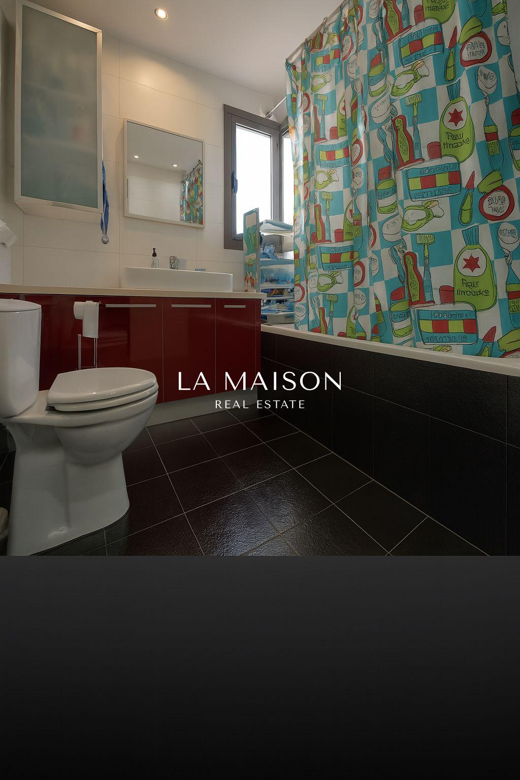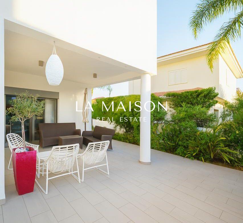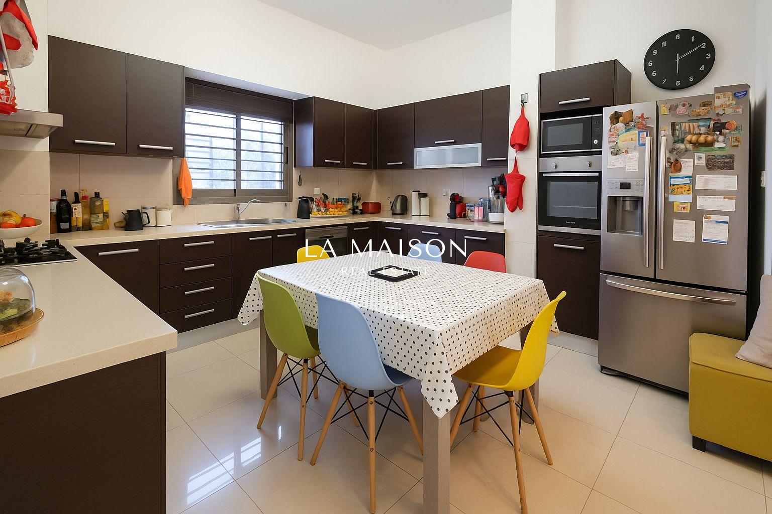 On the upper floor, there are four bedrooms with Italian wardrobes and a separate laundry room with built-in cupboards. The master bedroom includes an en-suite bathroom, while the fourth room can serve as a home office and has large sliding wardrobes and a balcony. All areas are fitted with LG air conditioning units, Italian wooden doors, and aluminum electric external blinds.