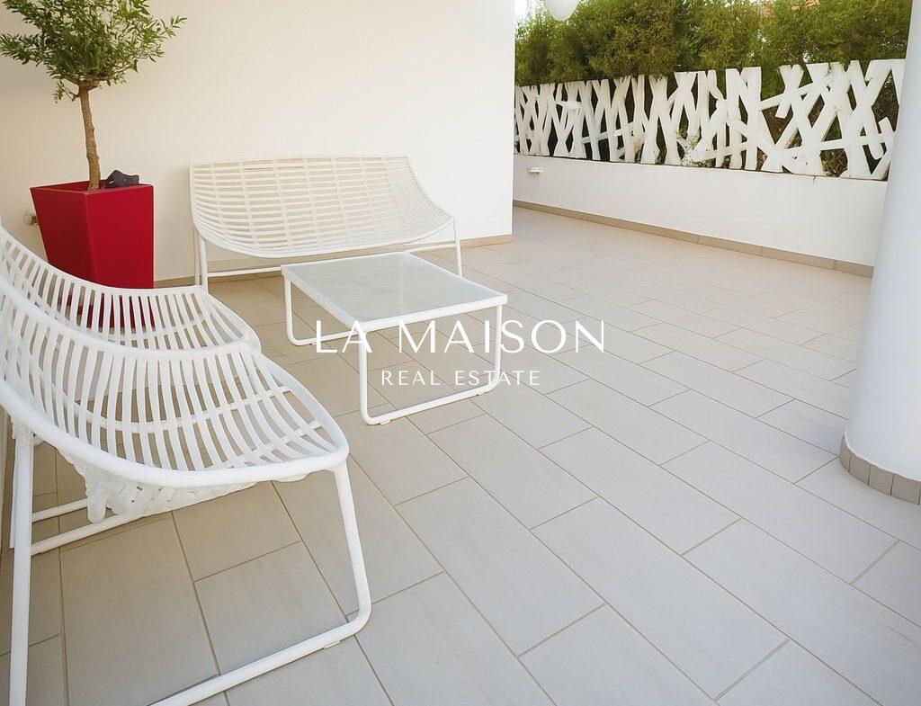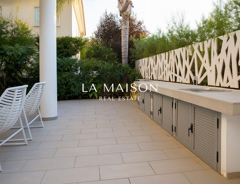 The ground floor consists of an open-plan layout with two modern lounges and a dining area, featuring a folding glass and stainless steel Italian dining table and an Italian energy fireplace with heat transfer to the upper floor. The Italian kitchen is fully equipped with high-end appliances, including Miele oven, microwave, odor absorber, built-in Nespresso coffee machine, a double Fisher & Paykel dishwasher, and a two-door LG refrigerator. There is also a modern guest toilet, a storage room, and direct access to a comfortable two-car garage.
