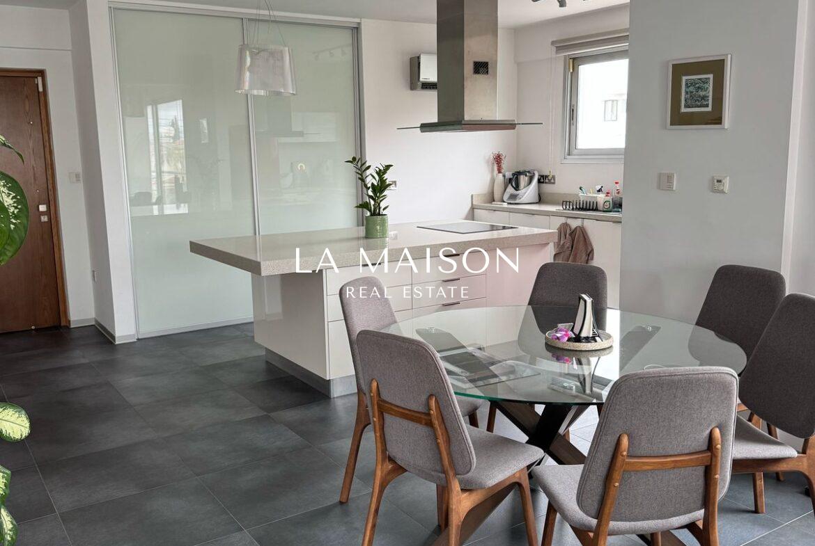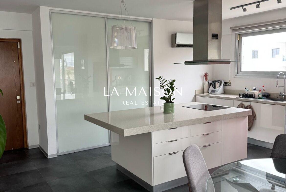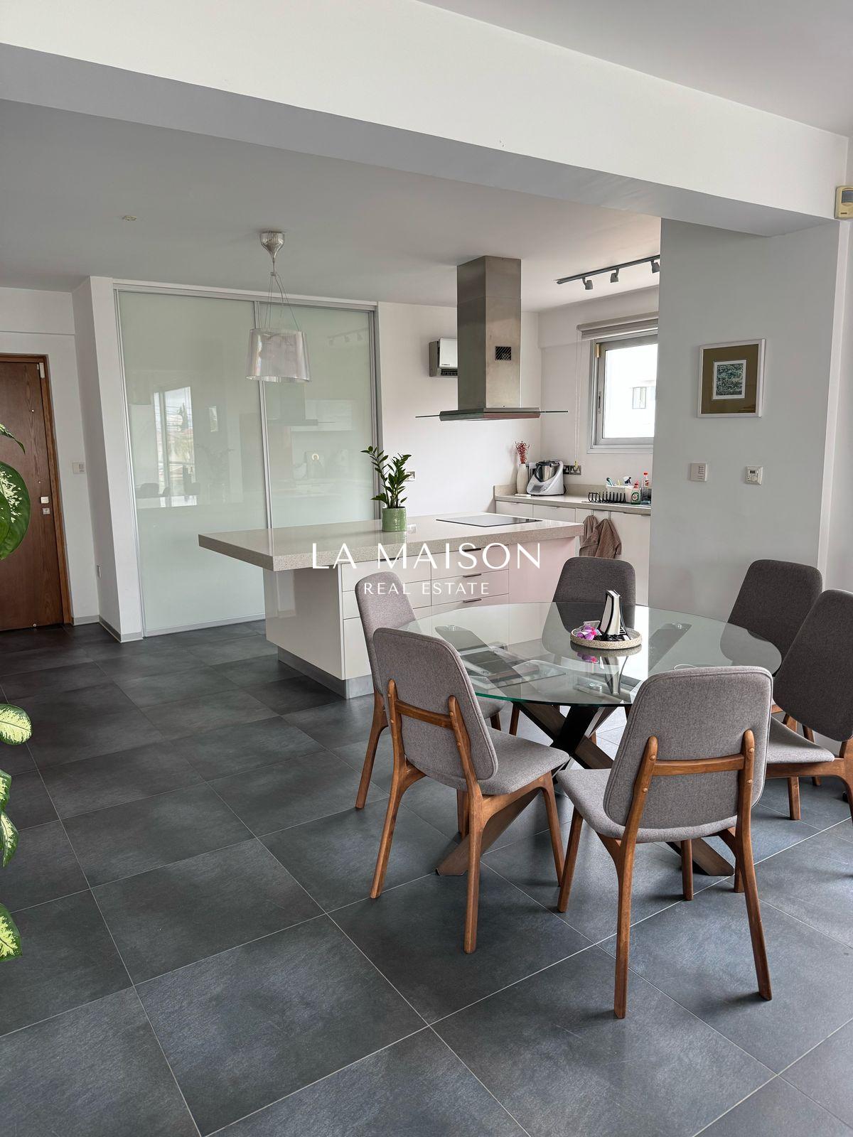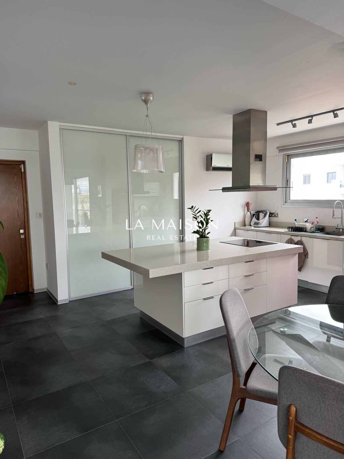 Located between Stavrou and Athinon in Strovolos, this fully furnished penthouse offers a unique blend of luxury and comfort. Originally a three-bedroom unit, it has been elegantly converted into a spacious two-bedroom residence with high-end finishes and modern design.