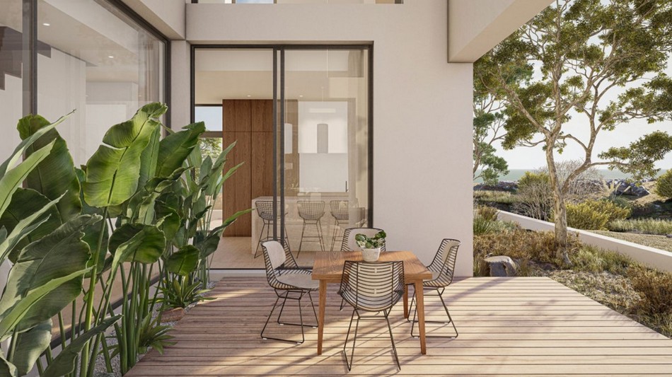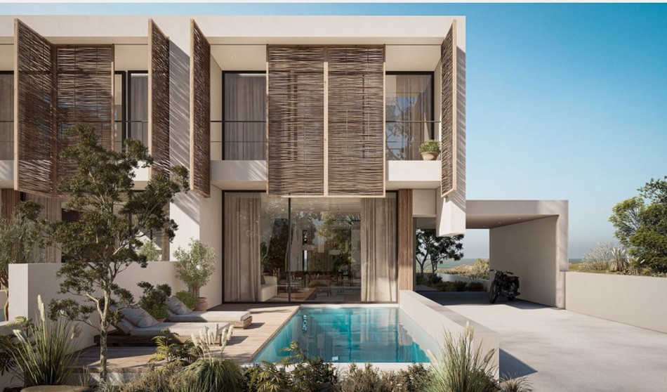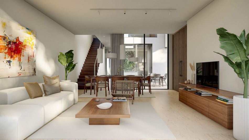 Every residence showcases an expansive living and dining space with an open-concept design, ideal for entertaining guests. The contemporary kitchen is equipped with marble countertops and all essential appliances, complemented by a bar-style high table. Additionally, there is a pool and garden on the side, offering the epitome of outdoor living.