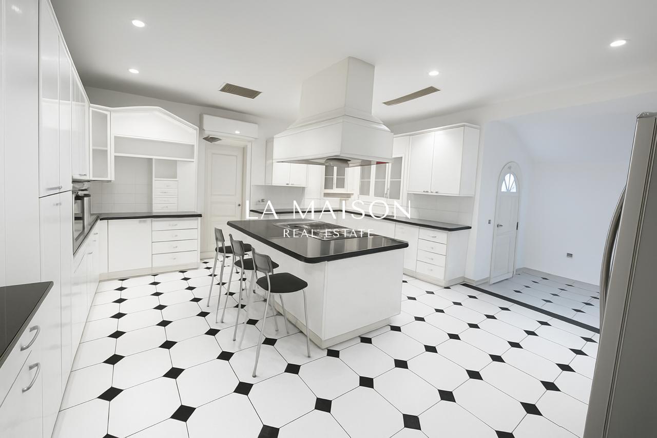 The main residence features eight spacious bedrooms and five bathrooms, three of which are en-suite. The primary bedroom epitomizes luxury with ample wardrobe space, an en-suite bath complete with shower and jacuzzi, and a private balcony with serene views over the landscaped garden and pool area.
