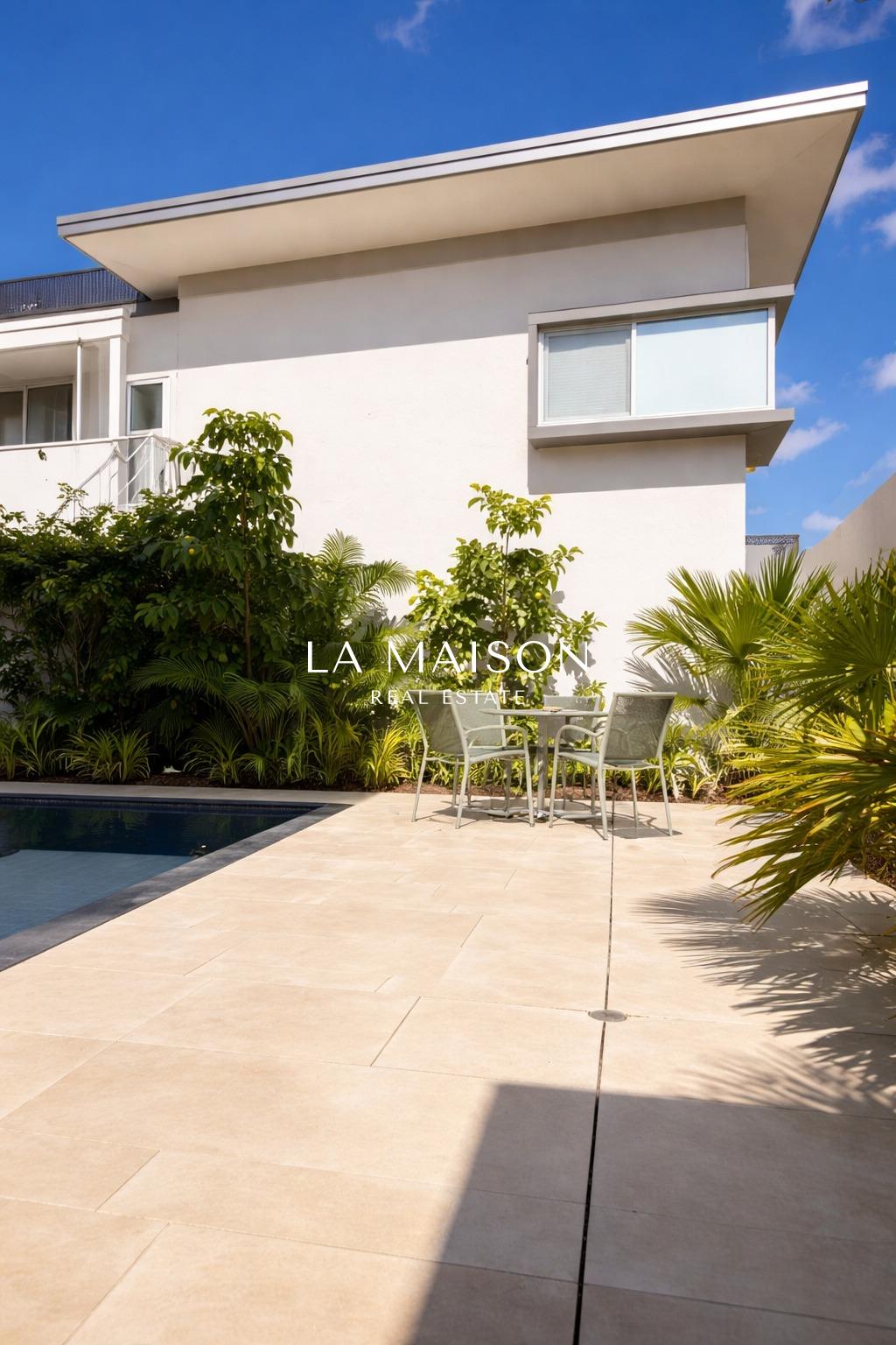 The transition between indoor and outdoor living is seamless, leading to a private garden retreat centered around a stunning overflow swimming pool. This outdoor sanctuary is designed for both intimate relaxation and high-end entertaining. Security and convenience are prioritized throughout, with a state-of-the-art alarm and camera system, electric shutters, and a pressurized water system.
