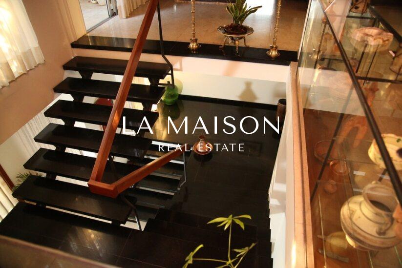 The property showcases a striking blend of timeless architecture and modern elegance, highlighted by an open black granite staircase, travertine marble walls, teak wood ceilings, and marble flooring throughout. Its expansive, interconnected open-plan living spaces are bathed in natural light through large windows, creating an inviting and airy atmosphere.
