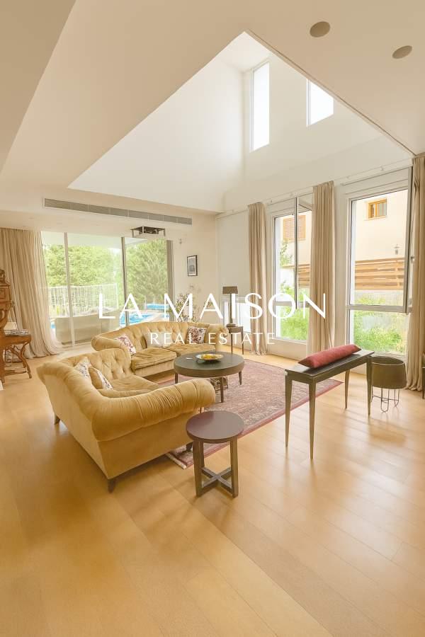 The interior impresses with its high ceilings, open-plan Italian kitchen, and premium finishes, including natural stone sourced from the mountains of Cyprus. The house is fully air-conditioned and equipped with underfloor heating divided into three zones, ensuring year-round comfort. All levels are connected by an elevator, adding convenience and accessibility.