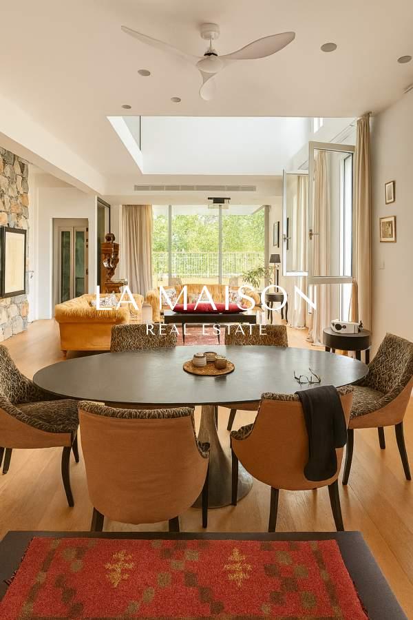 The outdoor area creates a true oasis, featuring a 12-meter swimming pool and access to a lush green area that gives the property a tropical, resort-like atmosphere.