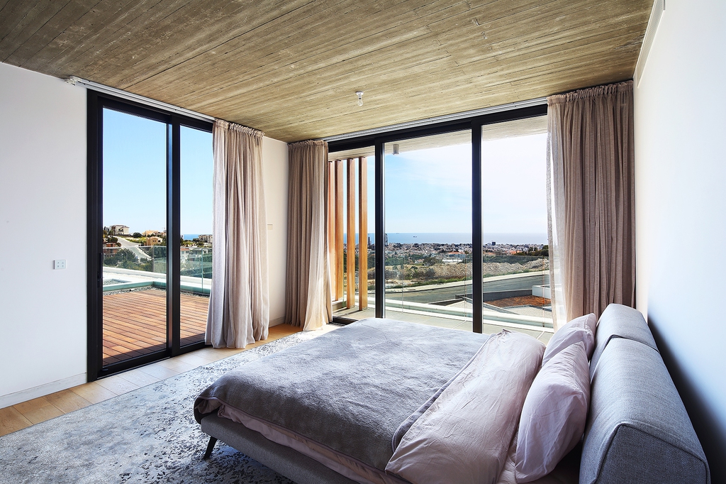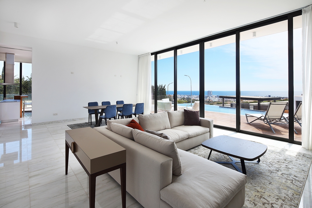 This elegant four-bedroom family home is perched on a hilltop with views of Limassol.