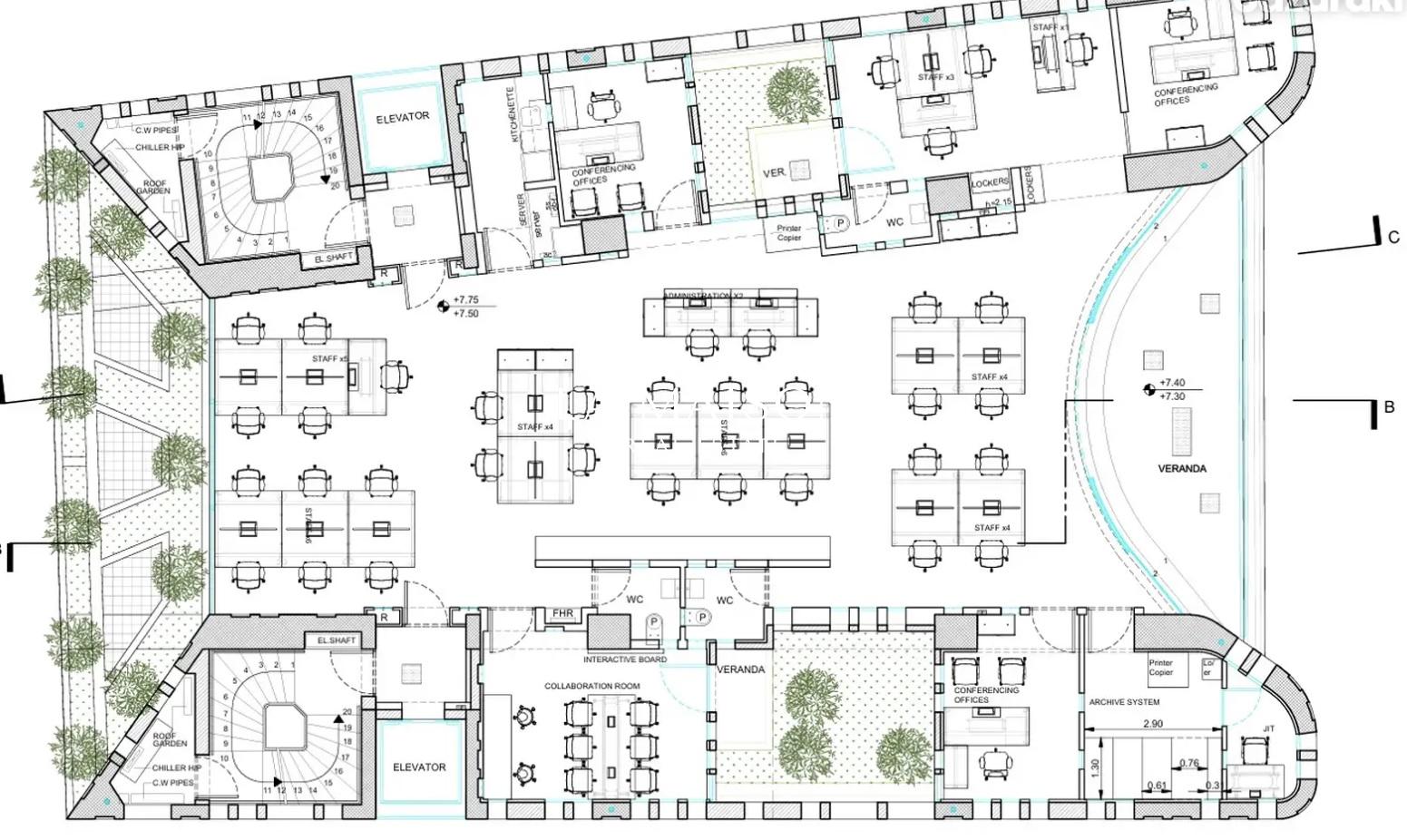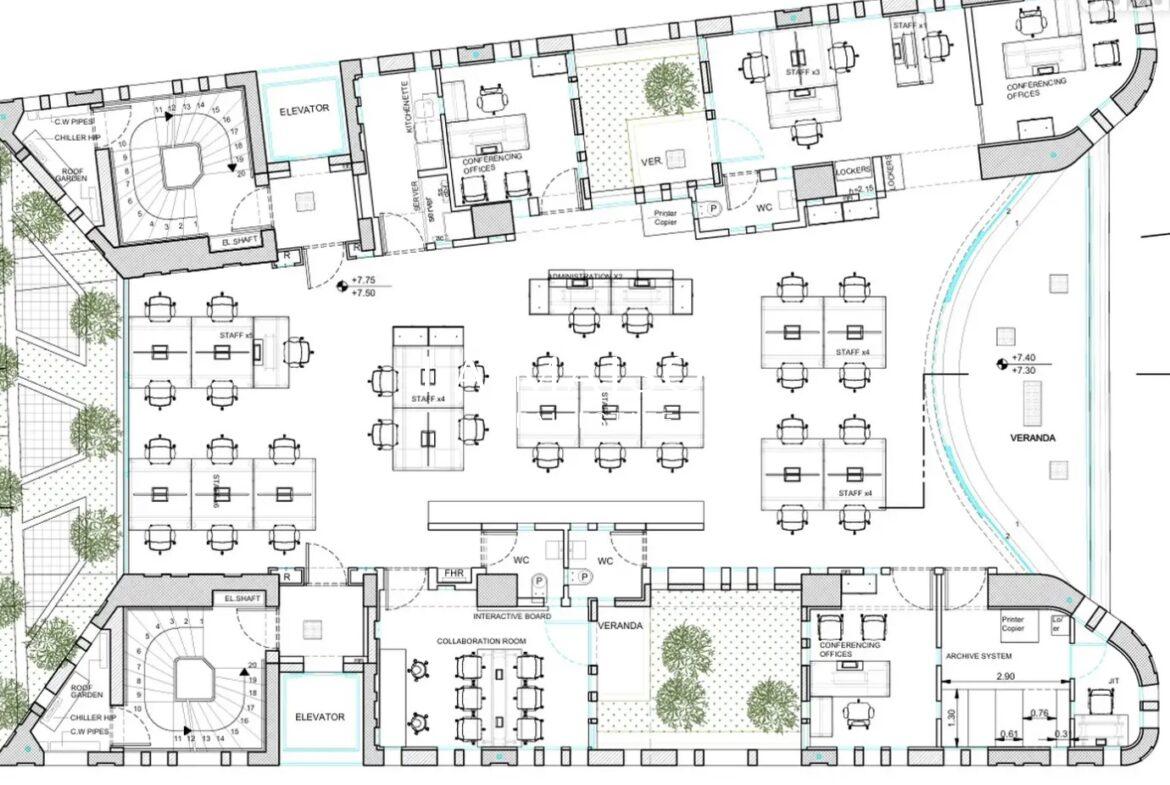 The property features 274 sq.m. of office space along with an additional 222 sq.m. mezzanine and garden area. Monthly property management fees for the Ground Floor and Mezzanine are €1,600 per floor, inclusive of 24-hour security.