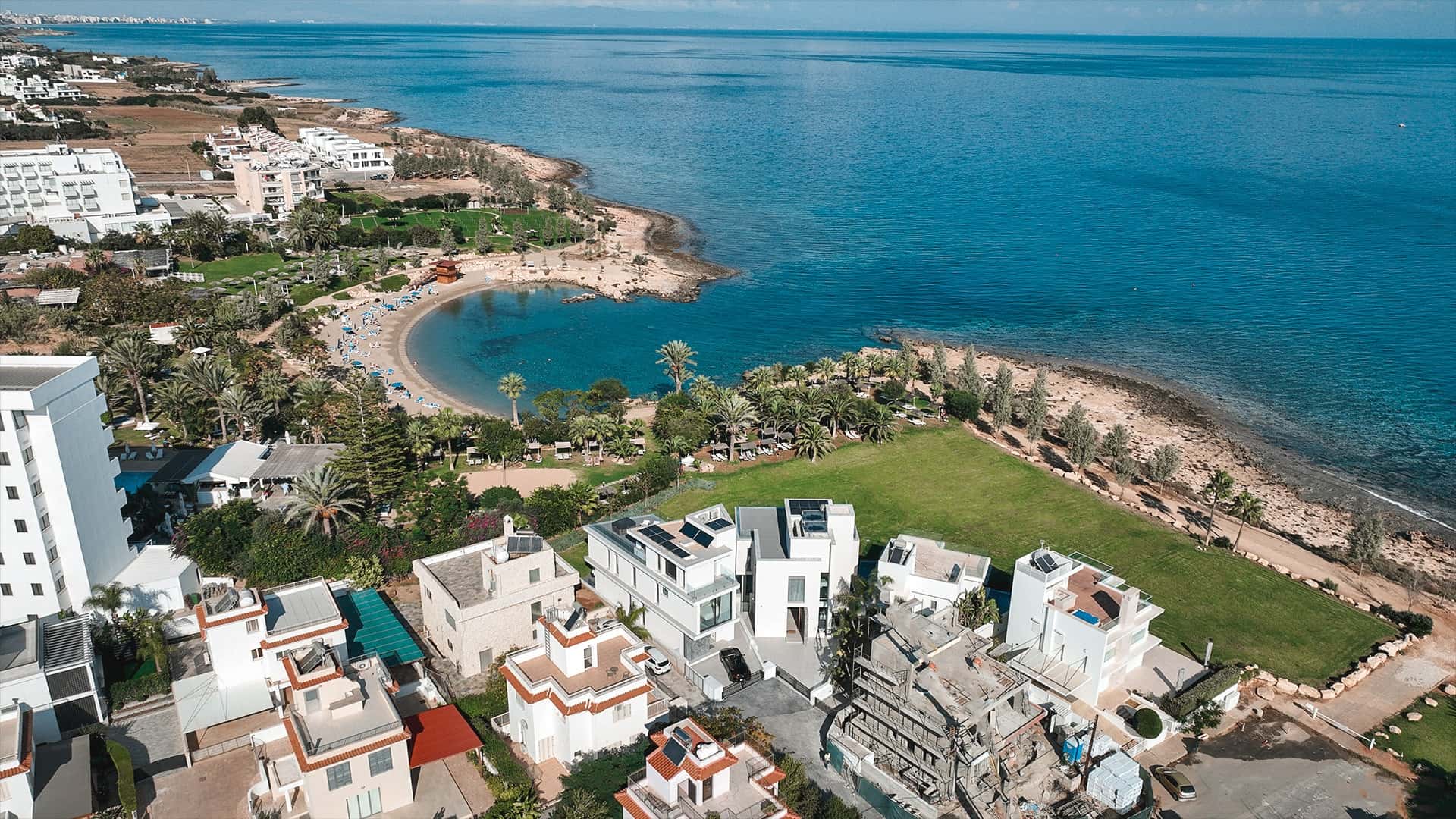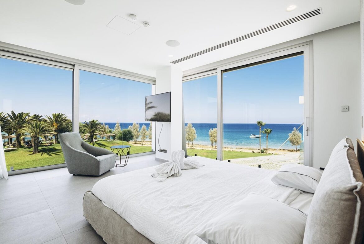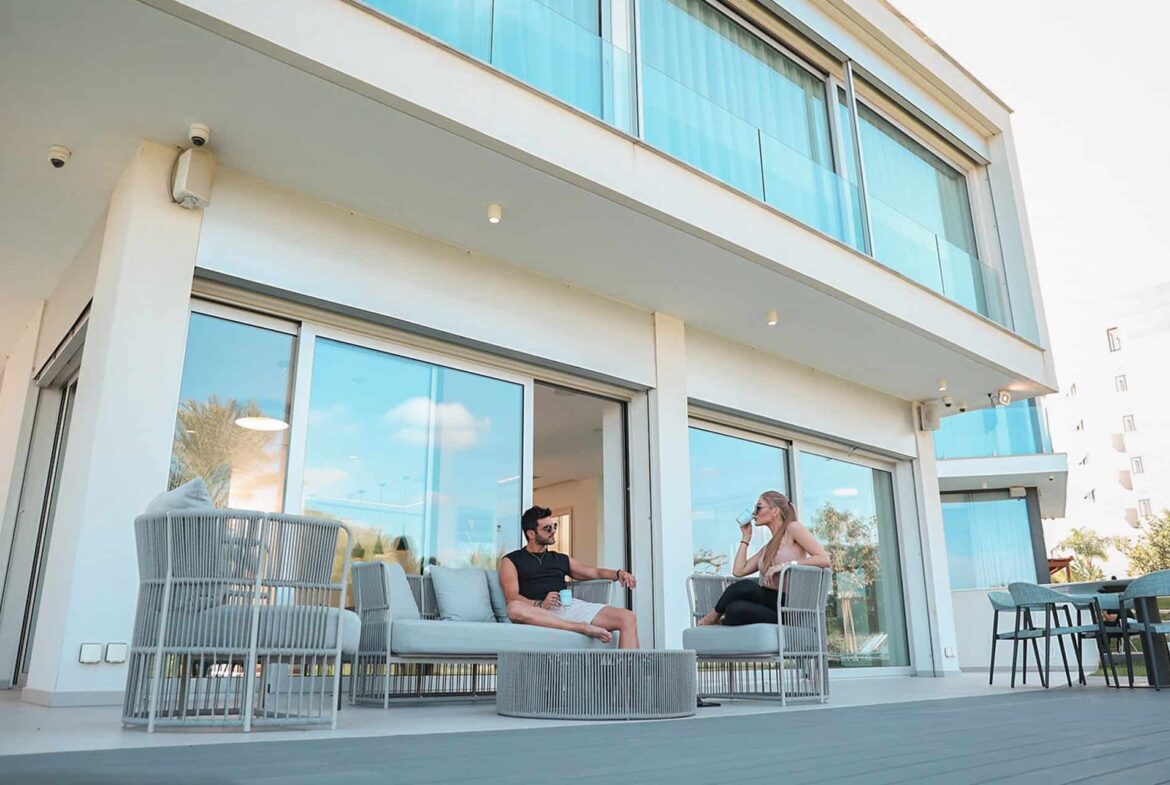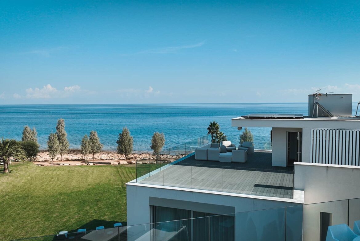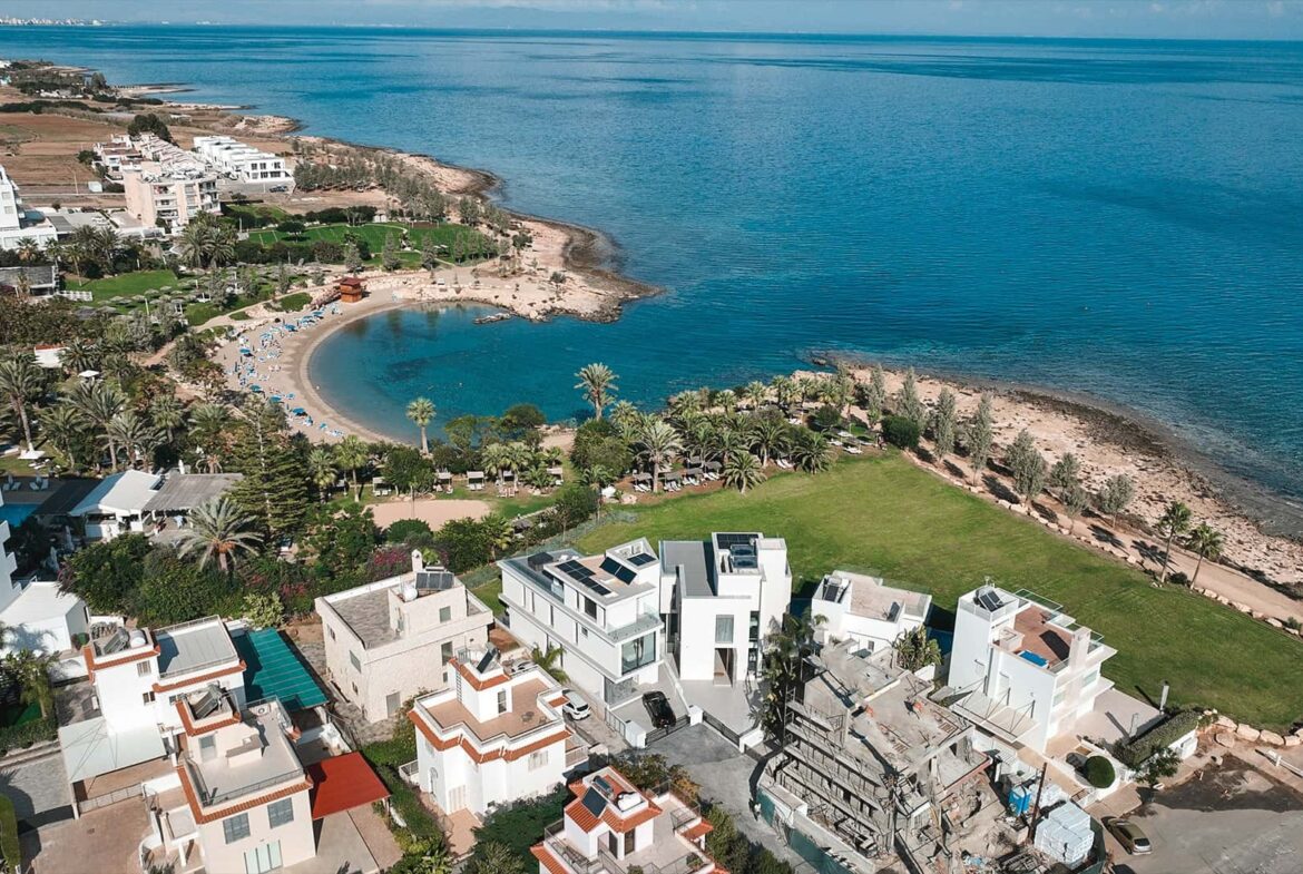 Are you longing for a home right on the beach, with turquoise Mediterranean waves just meters from your bedroom, offering a picture-perfect view? Do you have a love for contemporary architecture and cutting-edge technology? Are you particular about the quality and ambiance of your living environment? If so, you should consider arranging a viewing of this seafront villa in Protaras, a highly desirable resort area in Cyprus. Located in a boutique villa complex on the front line, it provides stunning panoramic sea views.