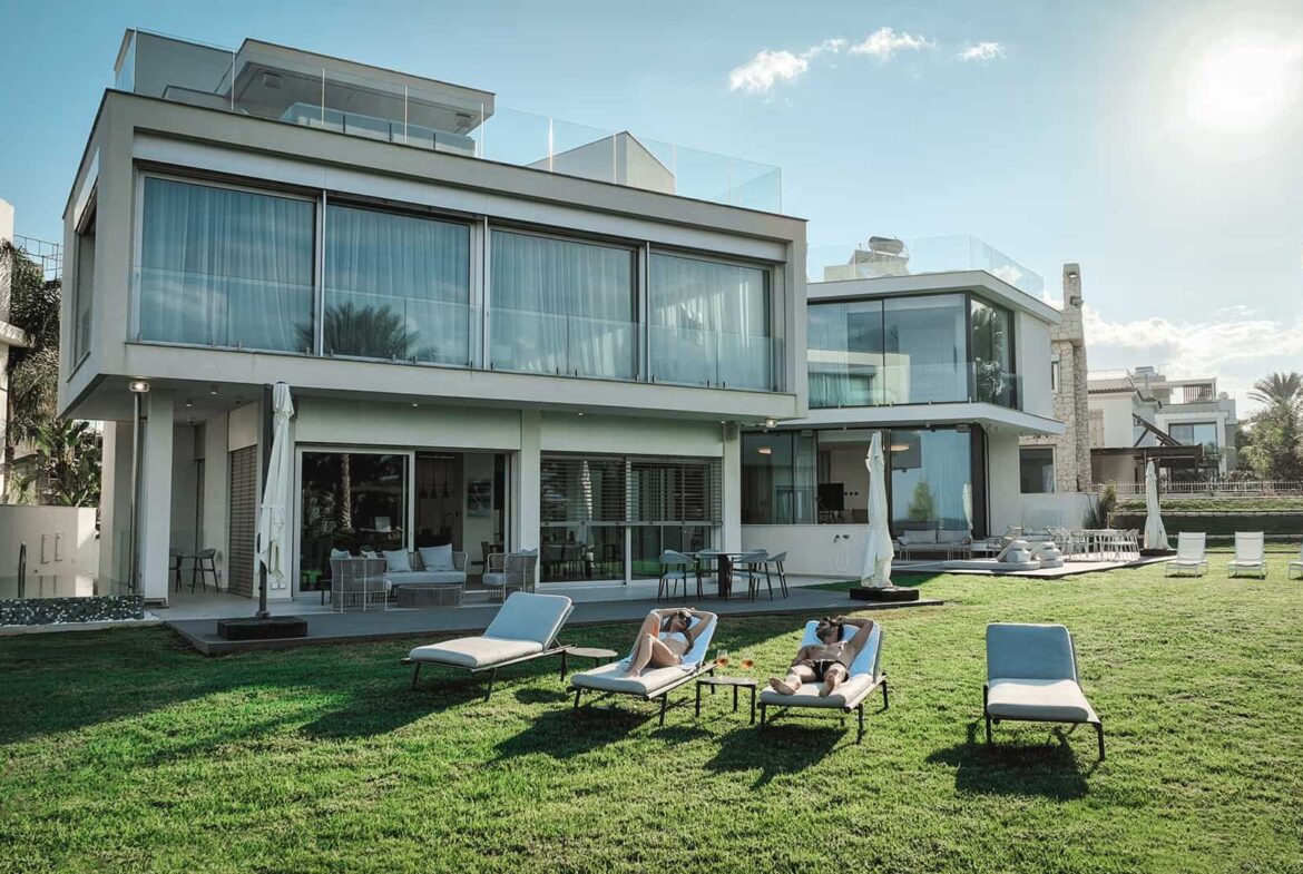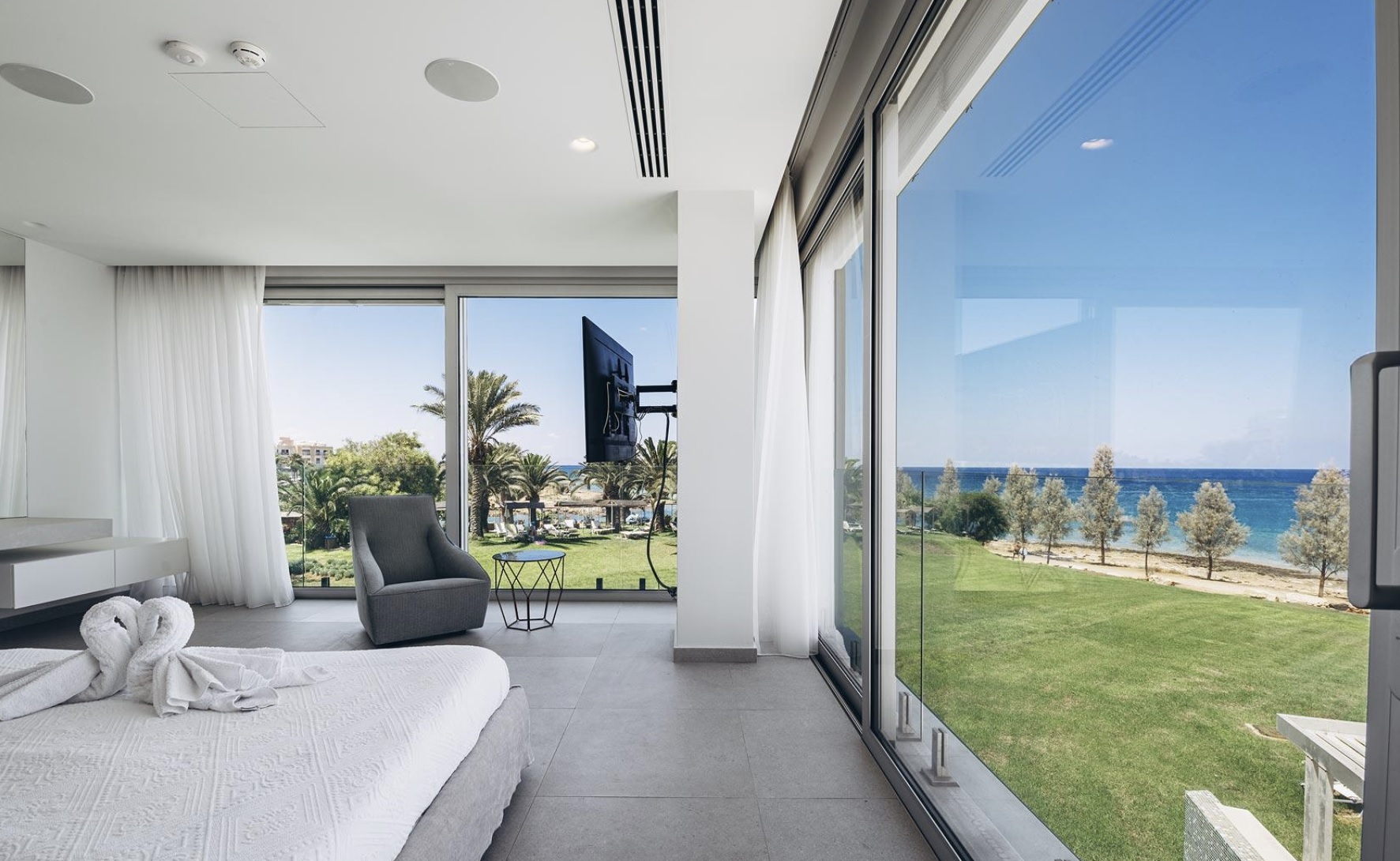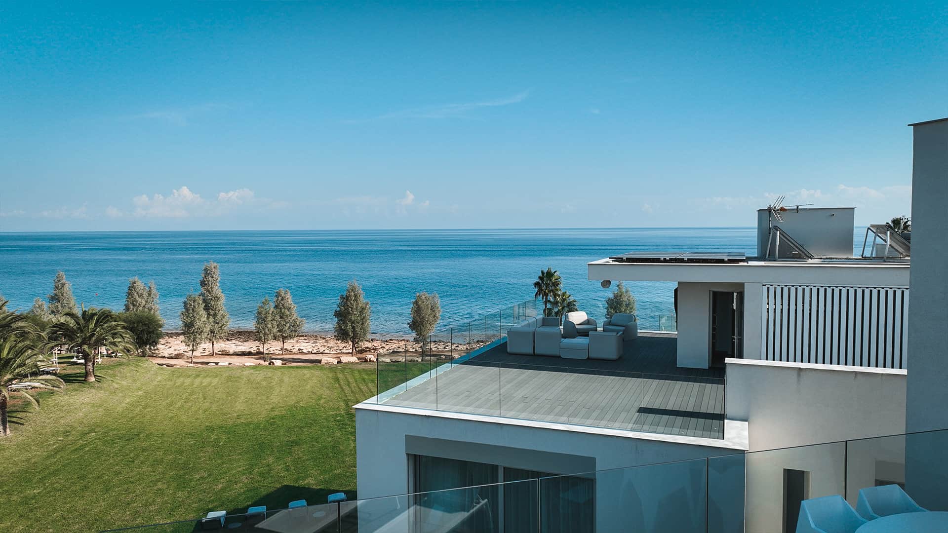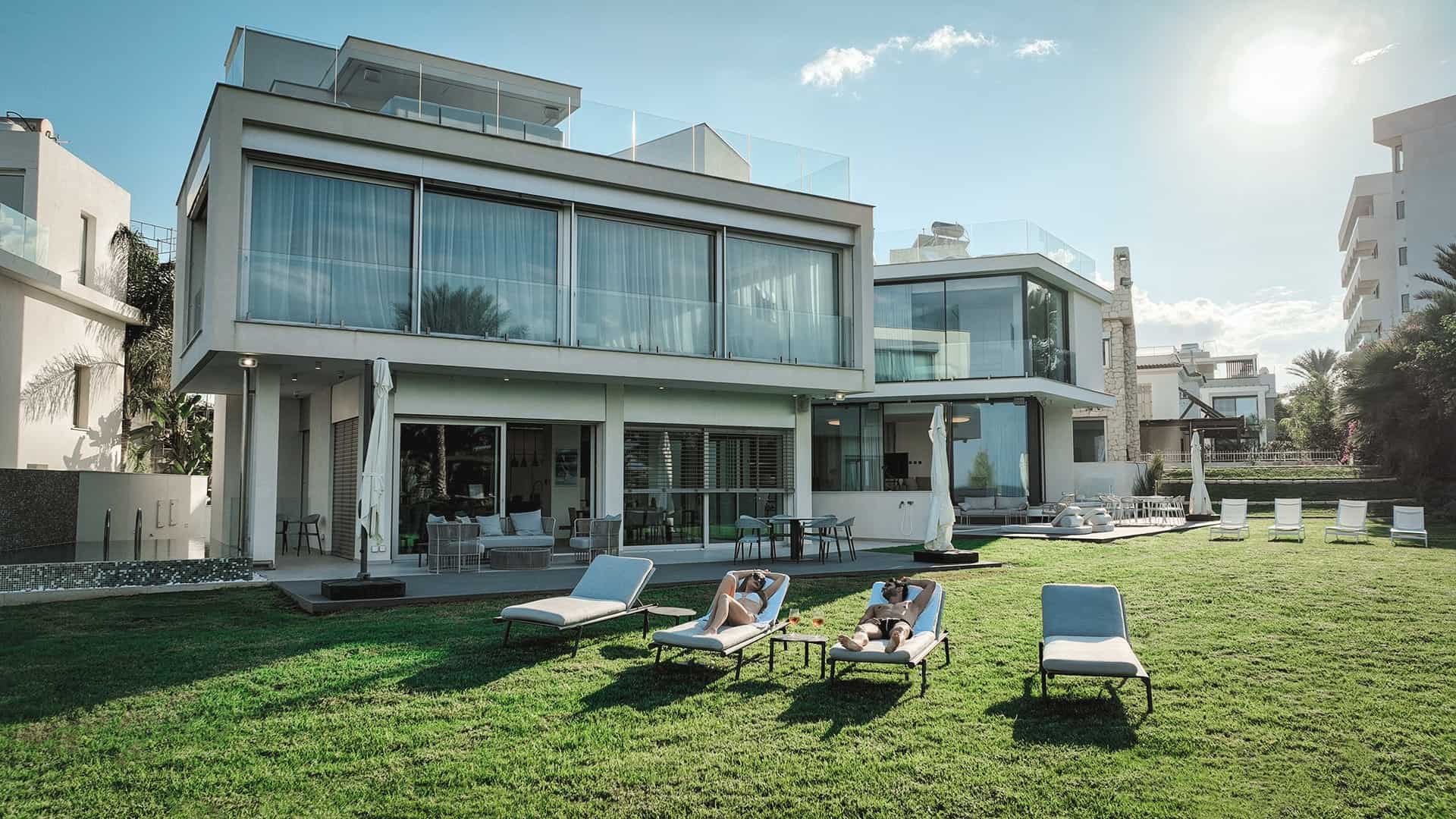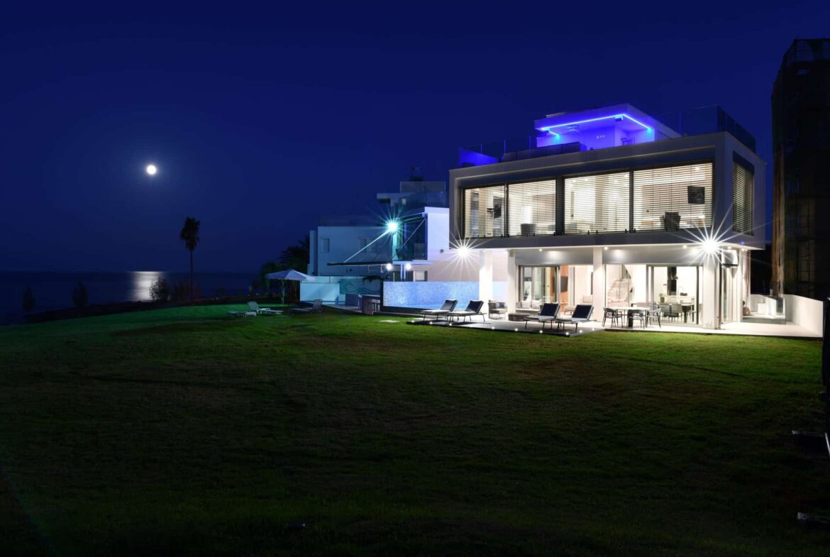 Are you longing for a home right on the beach, with turquoise Mediterranean waves just meters from your bedroom, offering a picture-perfect view? Do you have a love for contemporary architecture and cutting-edge technology? Are you particular about the quality and ambiance of your living environment? If so, you should consider arranging a viewing of this seafront villa in Protaras, a highly desirable resort area in Cyprus. Located in a boutique villa complex on the front line, it provides stunning panoramic sea views.