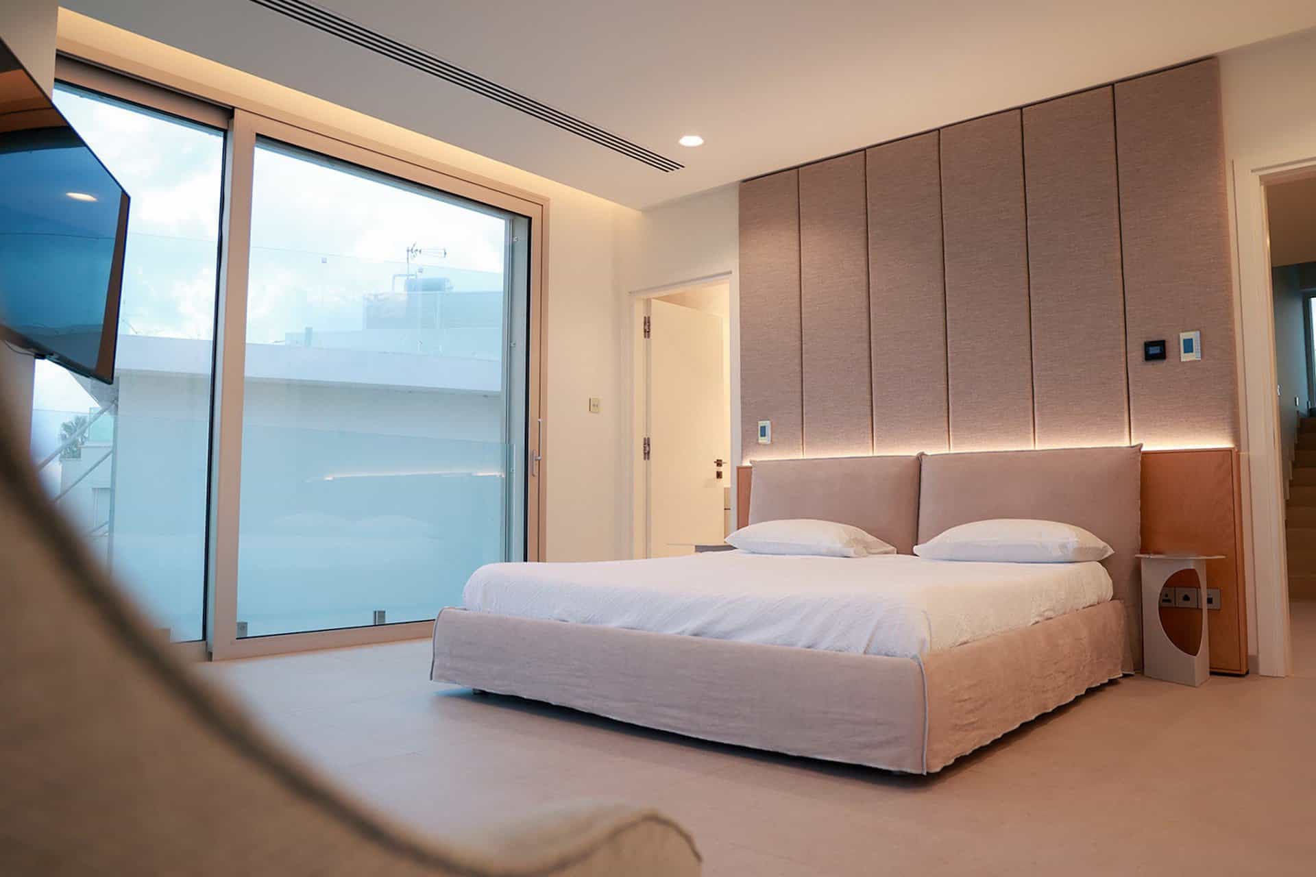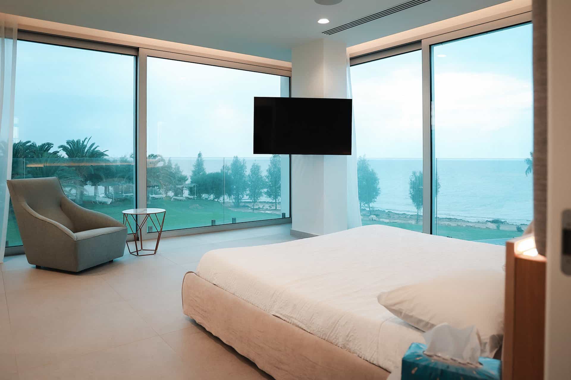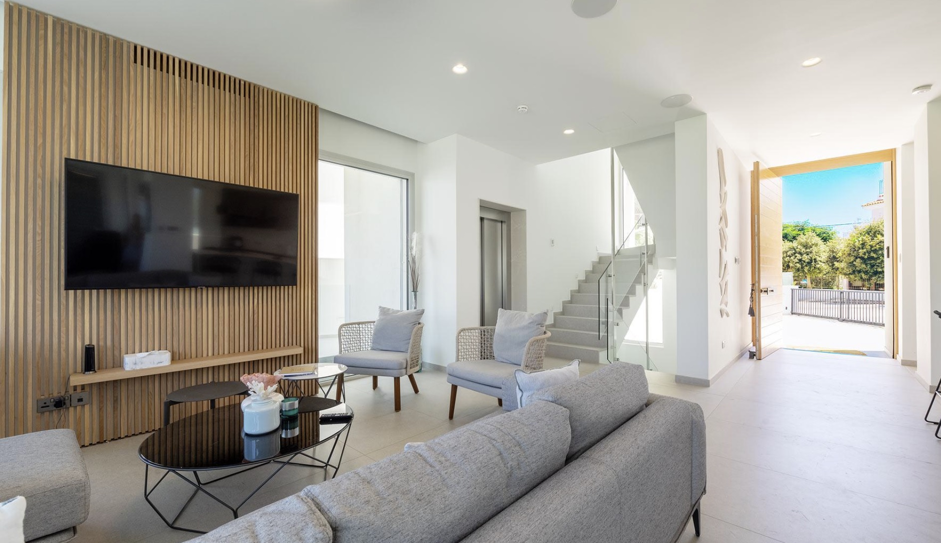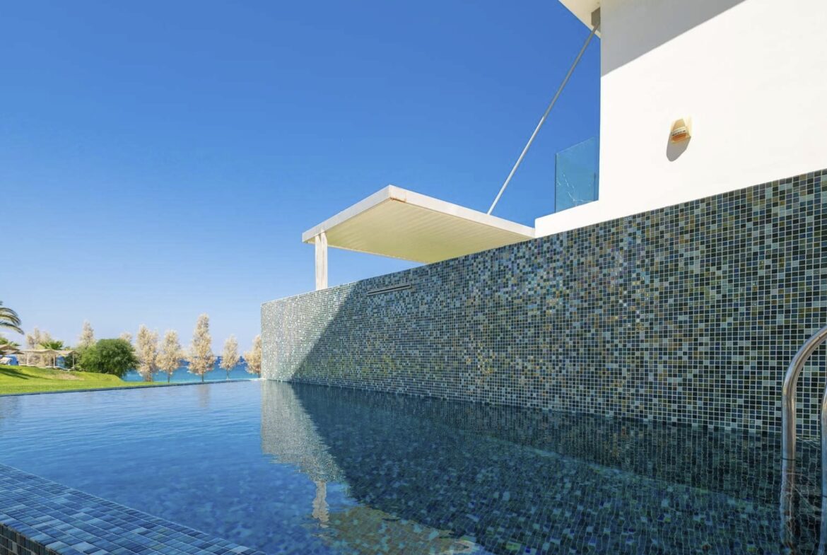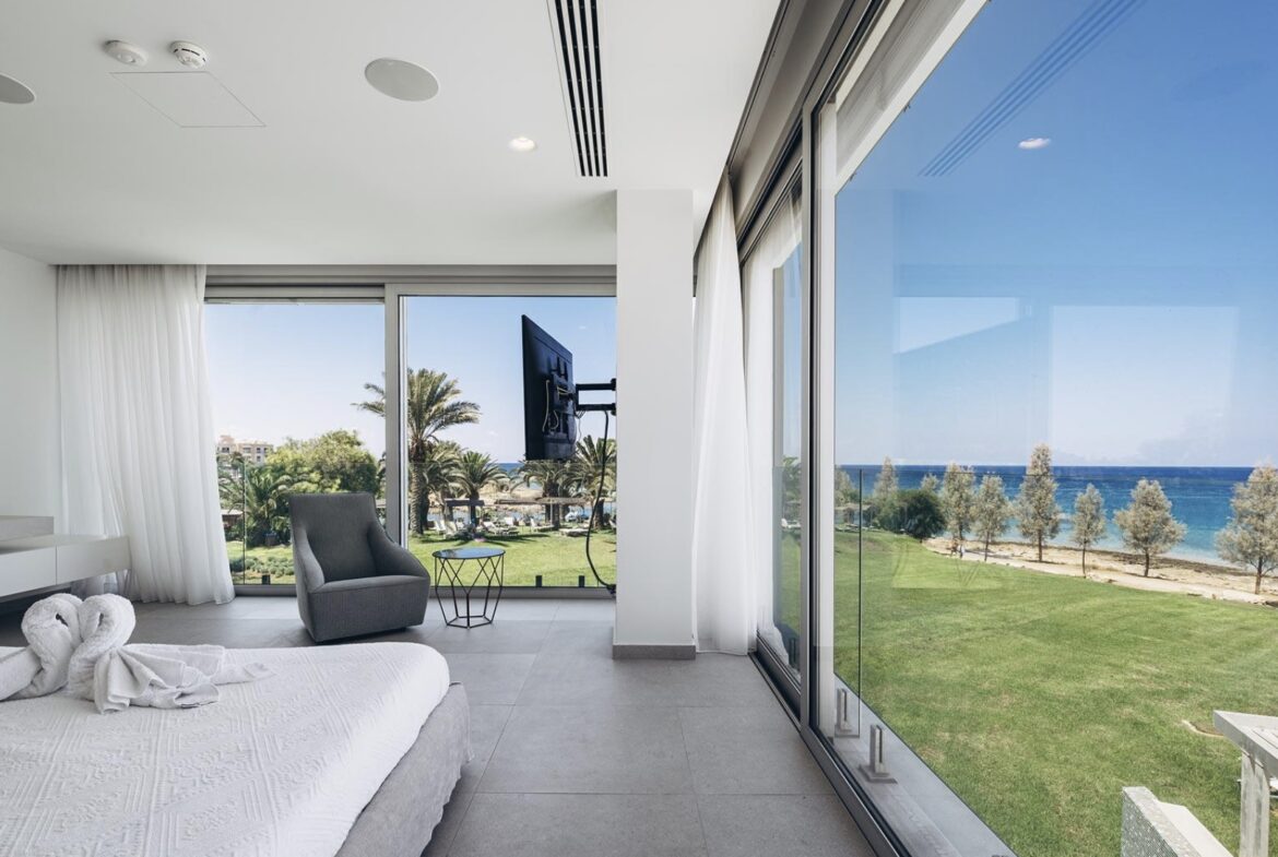 Are you longing for a home right on the beach, with turquoise Mediterranean waves just meters from your bedroom, offering a picture-perfect view? Do you have a love for contemporary architecture and cutting-edge technology? Are you particular about the quality and ambiance of your living environment? If so, you should consider arranging a viewing of this seafront villa in Protaras, a highly desirable resort area in Cyprus. Located in a boutique villa complex on the front line, it provides stunning panoramic sea views.