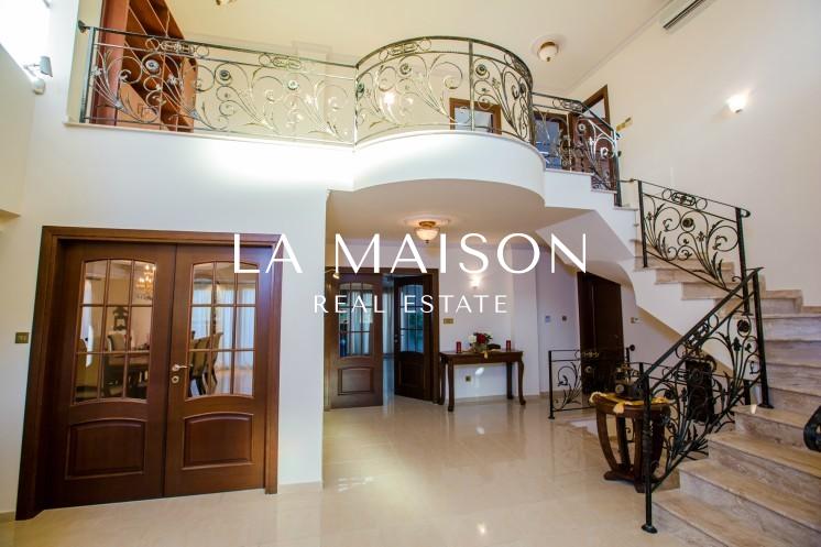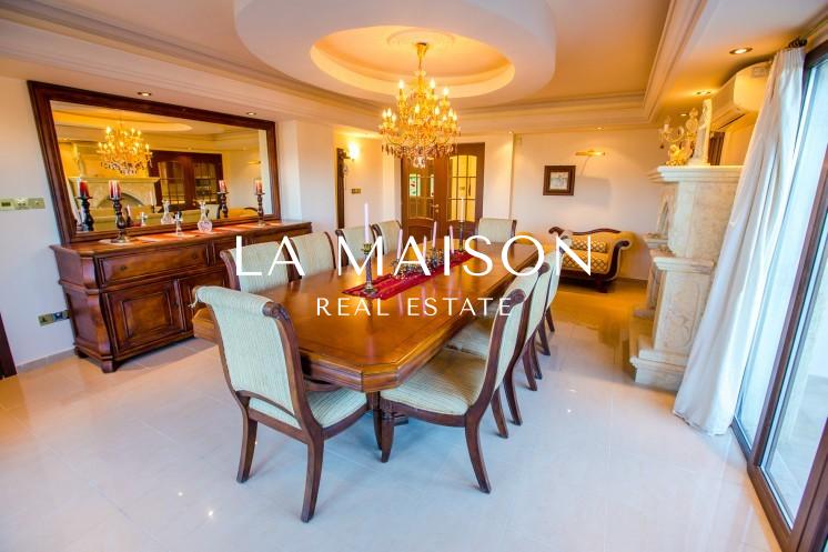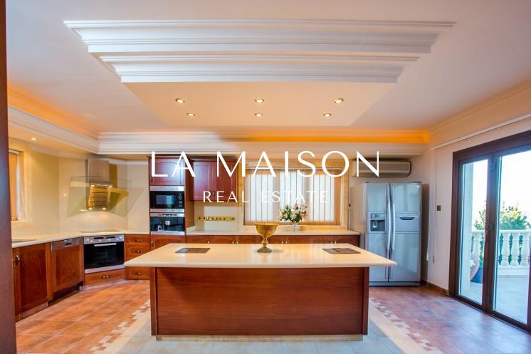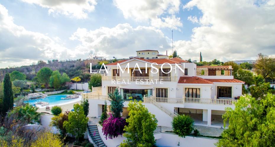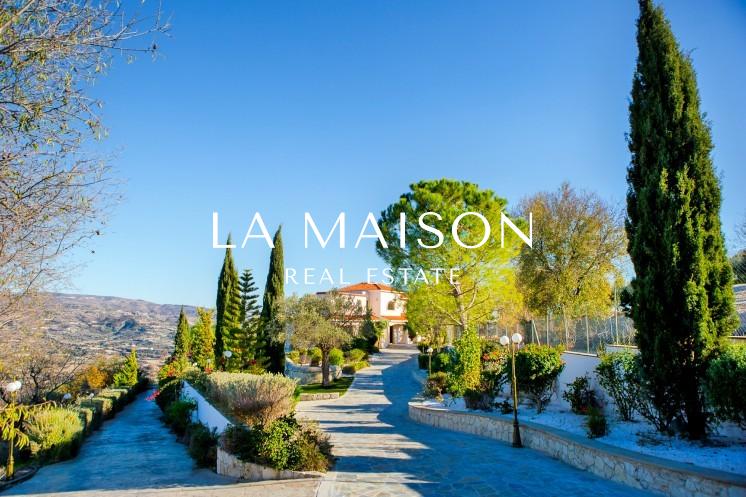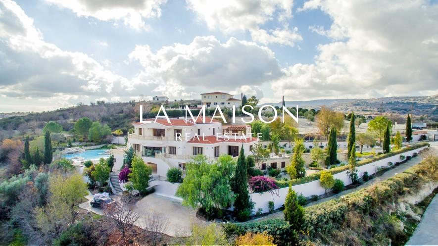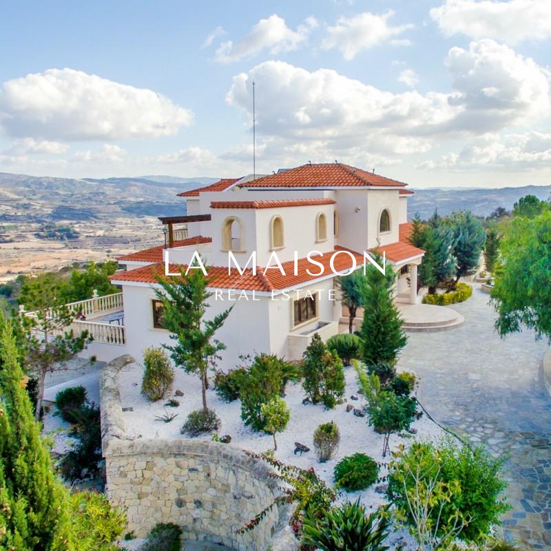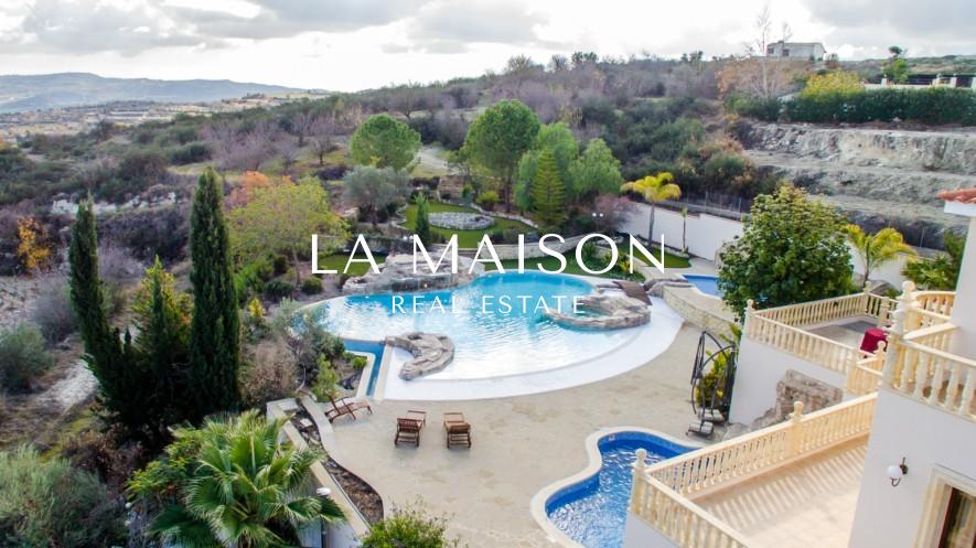 The villa consists of a 400m² covered area and a 267m²  covered basement which has all provisions to be easily transformed into two 2 bedroom apartments. The villa is built on a 5000m² plot which provides uninterrupted views of the mountains and the scenery of Cyprus nature. The outdoor area has two 2 impressive pools and a large mature garden. The interior of the property complies with the modern and the natural. Every room is designed so it maximizes natural light and ventilation. The villa has 5 large bedrooms, an indoor and outdoor Jacuzzi, a fully equipped kitchen, and a separated living and dining area each with its own fireplace. The villa has underfloor heating and a VRV system.