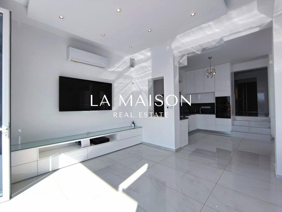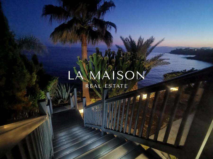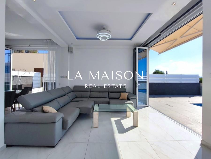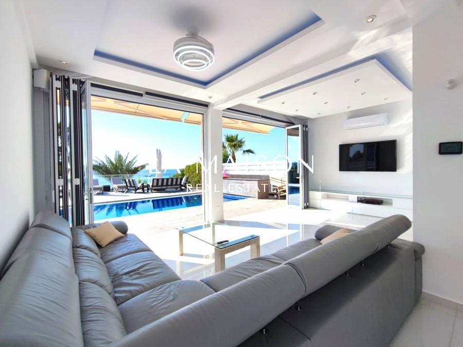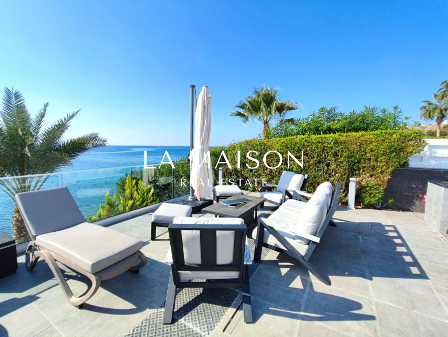 The villa offers a premium location with front-line access to the beach. Outdoor amenities include a private swimming pool, spacious verandas, and sun terraces, enhancing the experience of the Mediterranean setting. The open plan living room and kitchen contribute to the spacious and modern design of the house. Sliding doors open onto a large covered veranda, providing a seamless indoor-outdoor living experience. The top floor features bedrooms, including a master bedroom with an attached bathroom, and a massive terrace offering panoramic views.