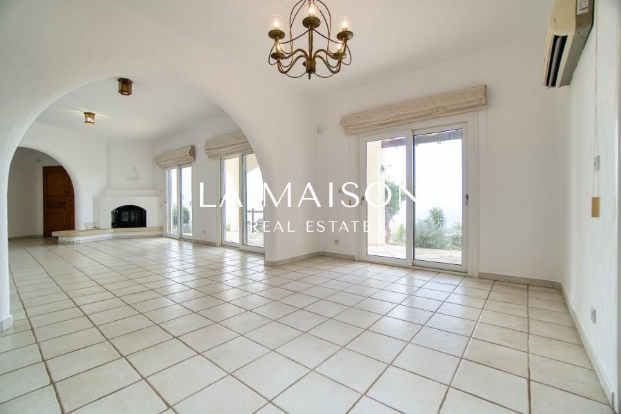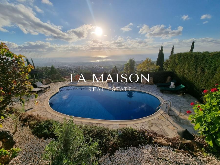 This enormous villa boasts majestic 180 degrees of the whole Paphos Coastline with incredible Mediterranean blue seas and breathtaking sunsets. Just walking distance from the Kamares Club House which offers all facilities – social club, concierge reception, restaurant, bar, events hall, swimming pool and medical centre. The quaintly pedestrianised Tala village square offers more entertainment, restaurants, pharmacy, supermarket and pubs which are only a short drive away. Located on the best road in Kamares – Kamares Avenue – the house is accessed by a private drive with turning circle for guests. Guests can enter through a private gate that takes them up a level to the pool area. Up another level is the front entrance and covered entertaining area. The lucky residents will enjoy a double electronic garage to safely protect their vehicles and they will use another internal staircase which was expertly crafted to look like a curved sea shell. The garage also offers a large storage area. The whole house is full of traditional arches in the classic Leptos style and is a masterpiece of the craftsmanship that propelled them to be one of the most successful developers in Cyprus. The architects designed every detail of the house to take advantage of the incredible views which can be enjoyed from every room with complete privacy! On the main level of the house there is a large open plan lounge with working fireplace to keep you warm and cozy. Central underfloor heating can be enjoyed during cold winter nights. Split level air conditioning units can change temperatures room by room to your comfort level. The open plan dining area leads out to a custom built BBQ designed by an Argentine expert. This connects to the large kitchen with a breakfast bar which is ideal for entertaining or large families. On the main level there is also a guest WC which is large enough to turn into another shower. Here there are 3 bedrooms. One was a music room, another an office and the 3rd was a guest room which has a large ensuite. The options are endless for a library, play area or gym. With all this space to play with, let your imagination run free and you can have everything that your heart desires. Upstairs on the top floor there are two further large bedrooms all with fitted cupboards and ensuites. Each bedroom also has a large uncovered balcony with fantastic panoramic sea views as a bonus. The house has a fully mature, irrigated garden with fruit and lemon trees for you to enjoy fresh lemons all year round! Please note that this house has been built on a DOUBLE plot and therefore the house is large and the grounds are extensive