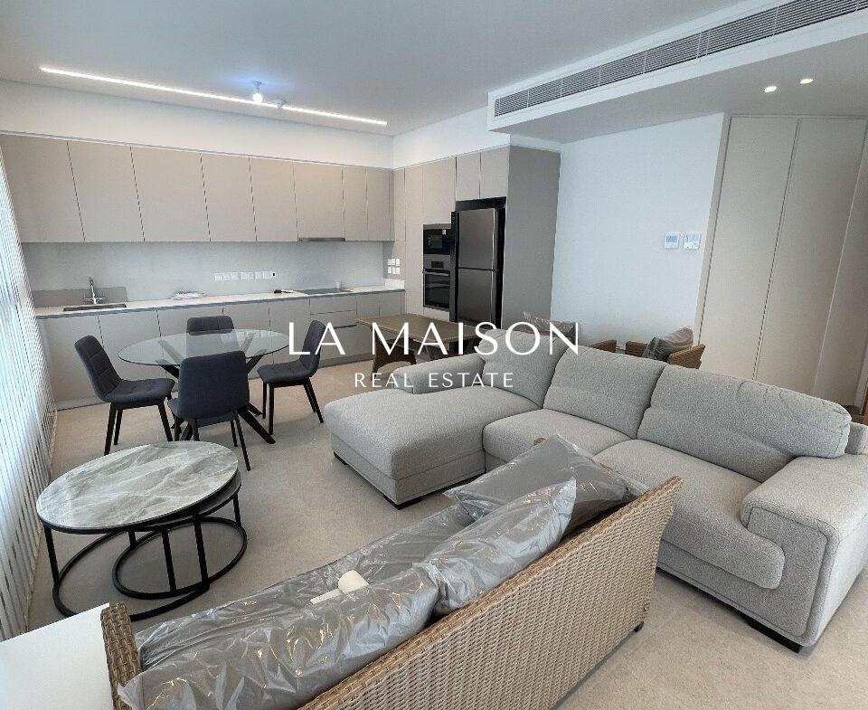 The apartment features two spacious bedrooms designed for both comfort and style. It is fully air-conditioned, providing optimal climate control throughout, and also includes underfloor heating for cozy warmth during the cooler months. The building is equipped with the latest smart home technologies, making daily living seamless and convenient.