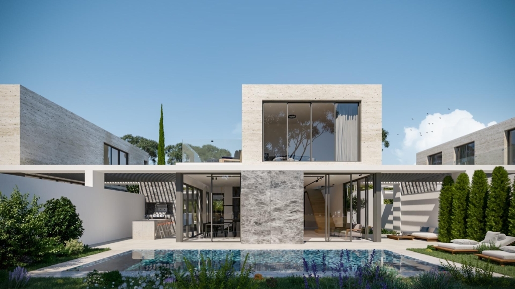This property showcases a unique functionalist architectural design with panoramic windows offering great views of the garden. The large covered veranda and ground floor living space are just steps away from a refreshing swimming pool, and a bit further, the barbecue area with its own dining space provides perfect outdoor living for the whole family. Inside, the house features four spacious bedrooms, three...