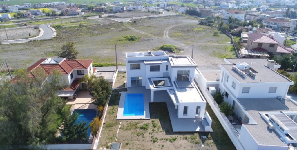 a Modern design property in a big plot with double covered parking Located in a beautiful area of Latsia, big verandas and garden with a swimming pool and deck around. On the ground floor the double living room, dining room and family sitting / dining and kitchen areas have a view to the garden. There is also a guest toilet and a separate entrance from the double garage. Upstairs there are 4 big...