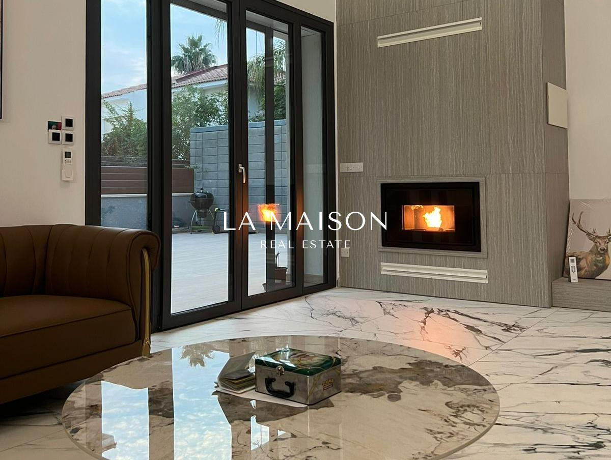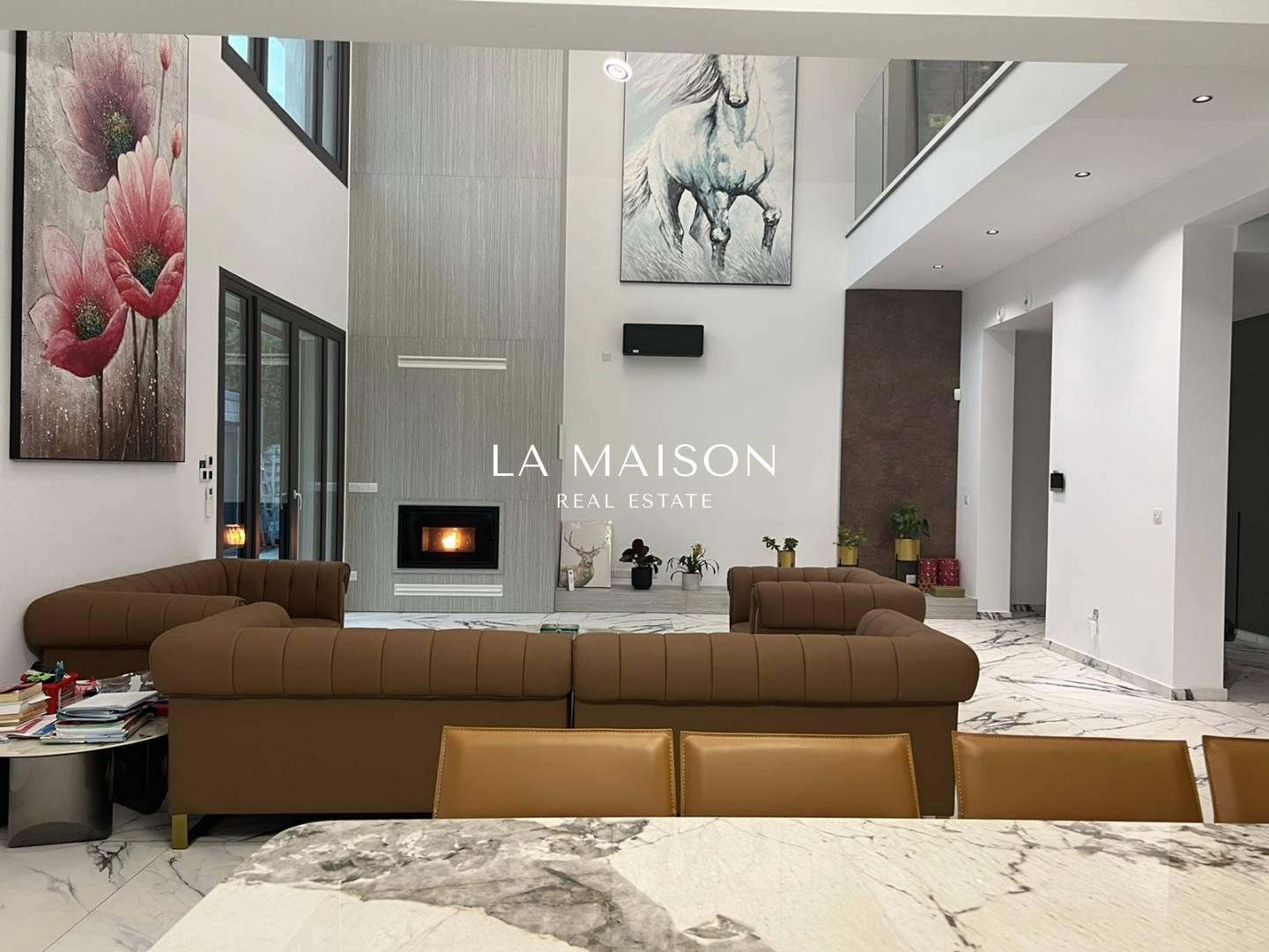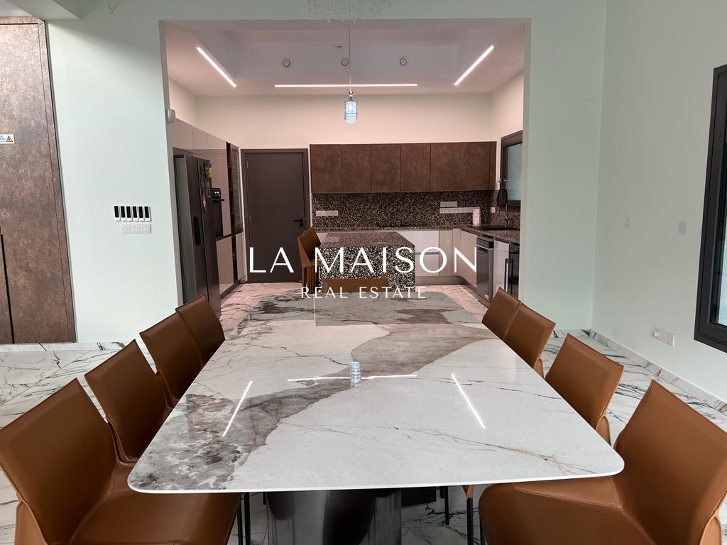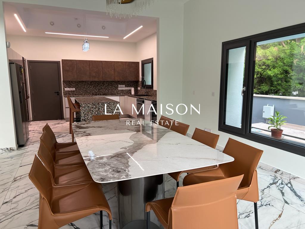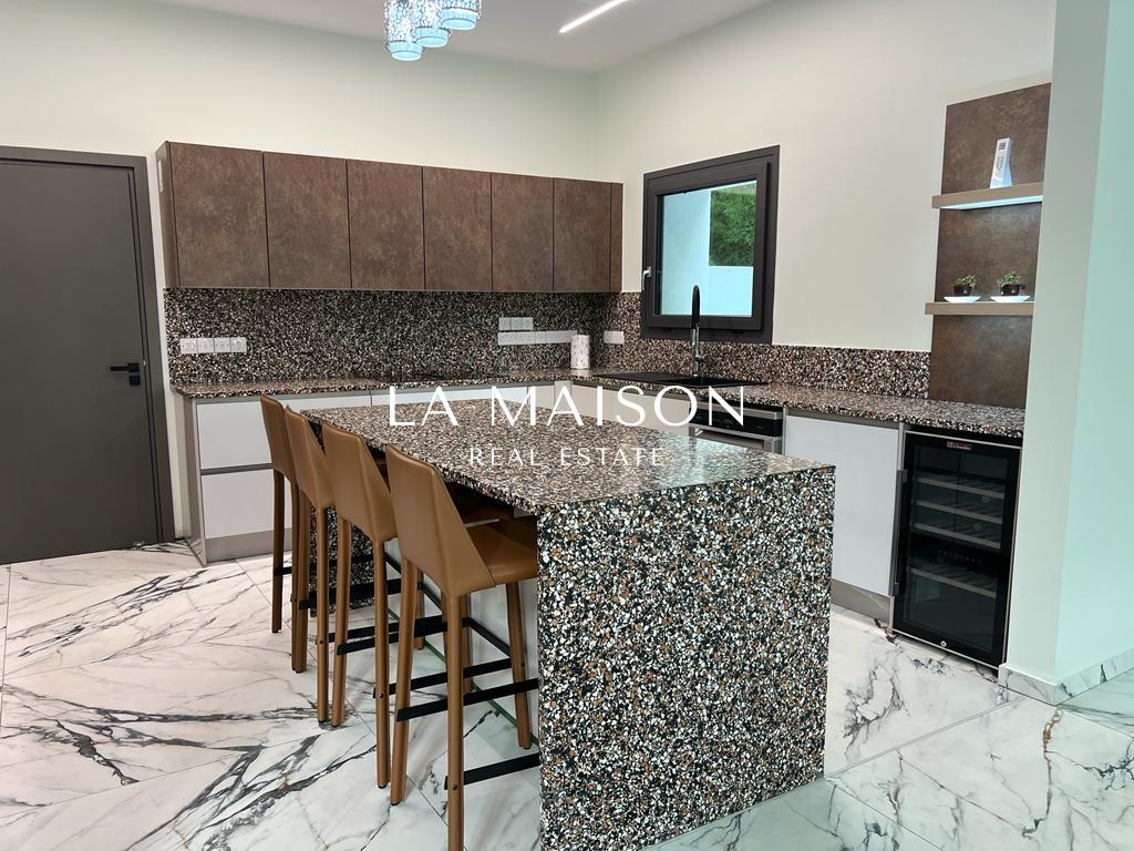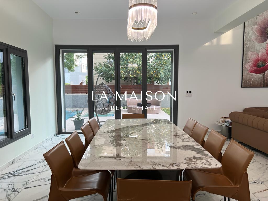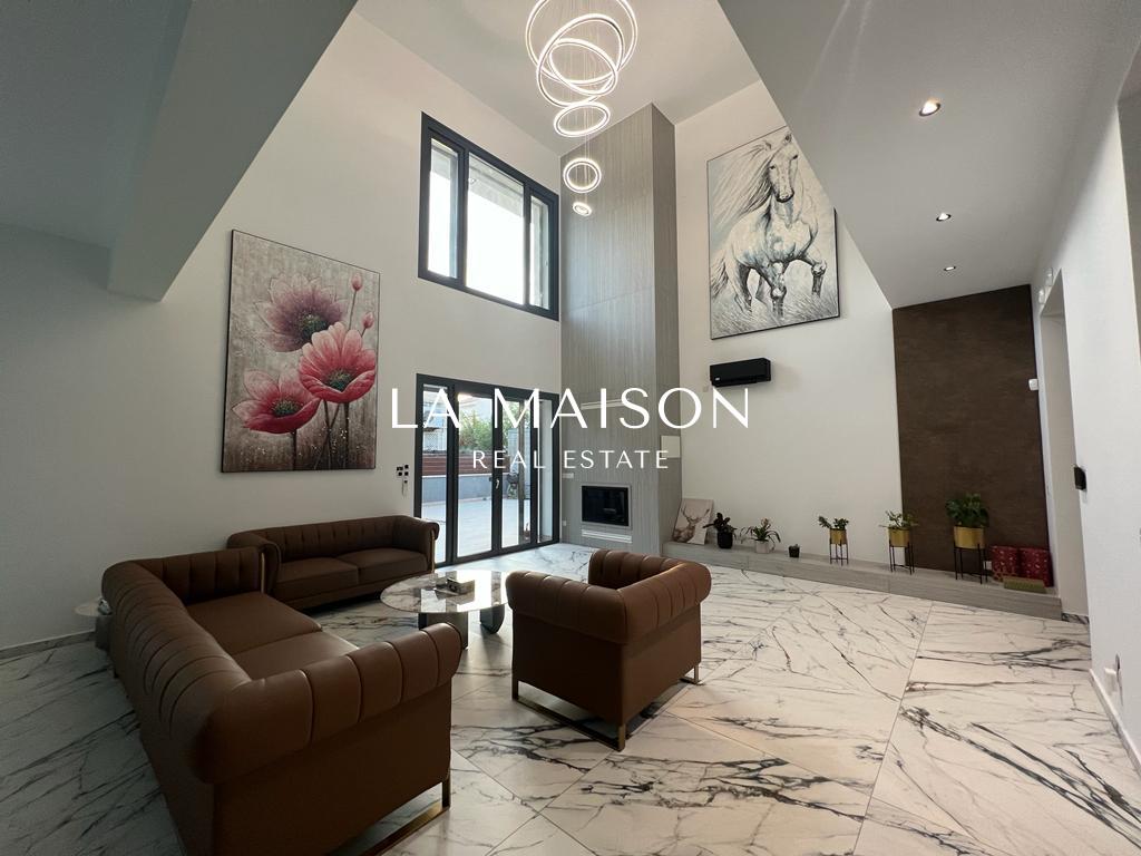 Luxurious detached two-story residence situated in the Archangelos Area of Strovolos. This contemporary home features a generous ground floor layout comprising a spacious living room with a fireplace, a dining area, a fully equipped kitchen, and a guest toilet. Upstairs, there are five bedrooms, each with its own en-suite bathroom. The basement hosts storage spaces and an en-suite maid’s room. Additionally, a sizable roof garden offers breathtaking city views.