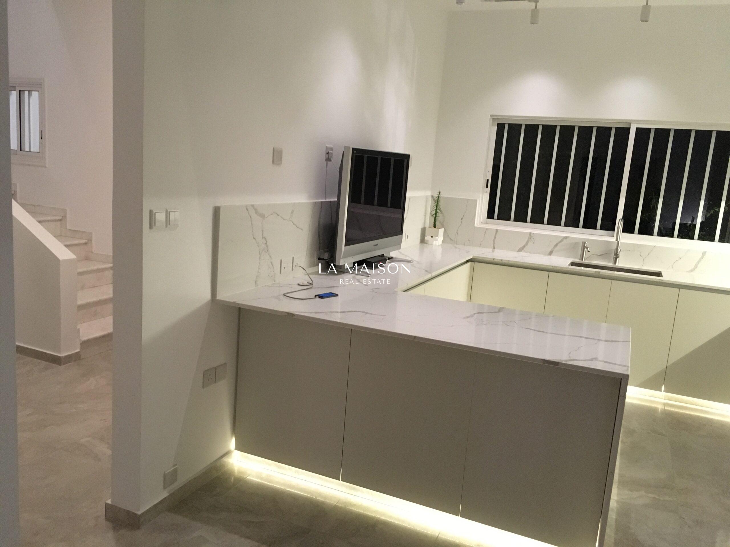 The house features three generously sized bedrooms, including a master with an en-suite shower room, a family bathroom, and a guest washroom. All bedrooms are equipped with newly installed illuminated wardrobes, providing ample organized storage space.