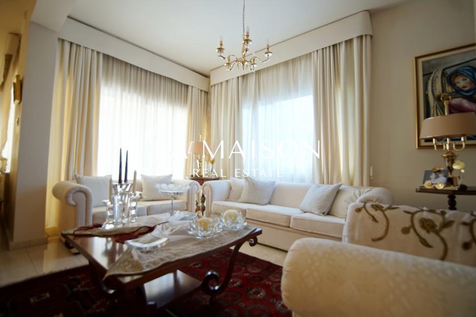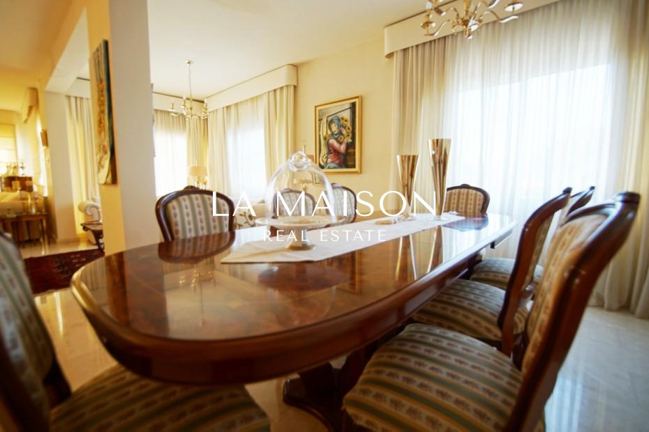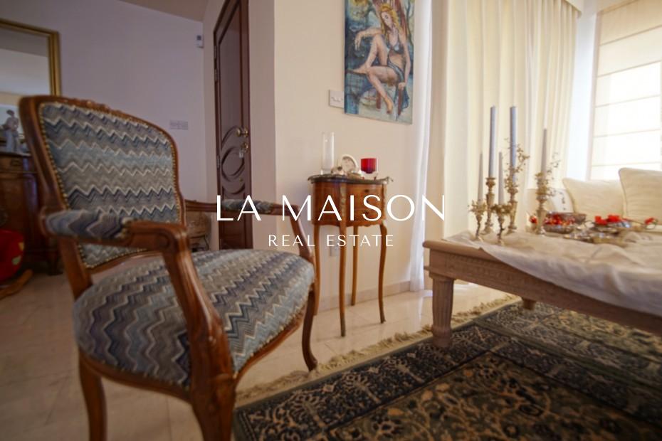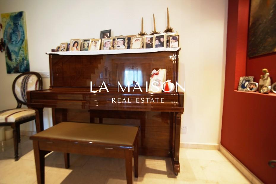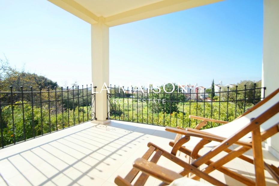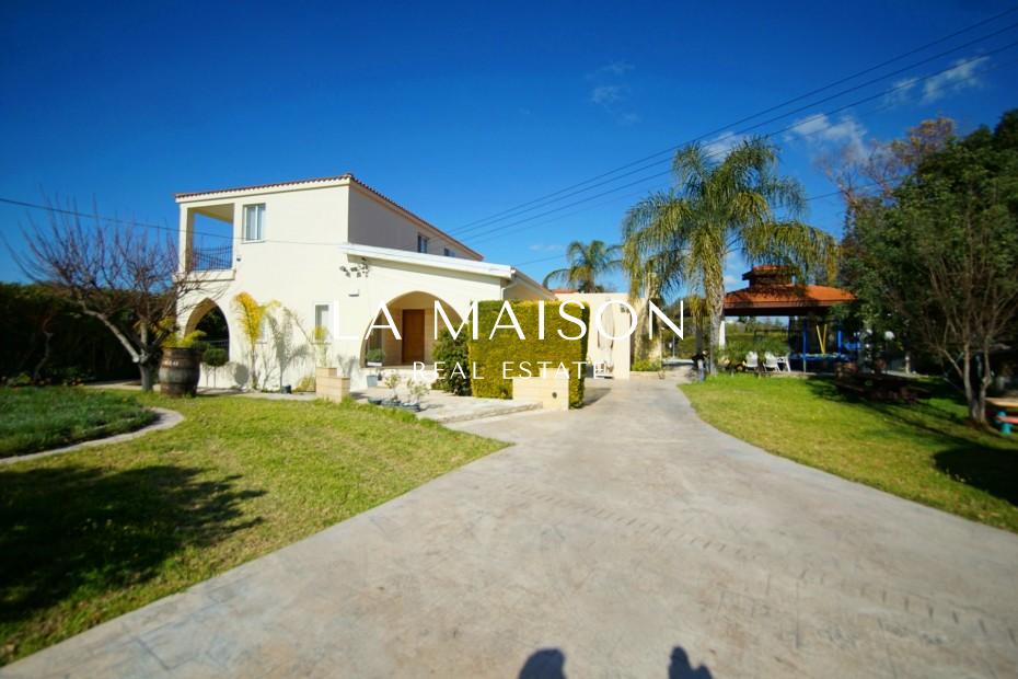 The villa is situated just 1km away from Paphos centre. With a plot of 1673m2 and neighbors in plots of approx 1500m2 It is a big family 4 b/r villa. The upper floor is 120m2 and consists of the luxurious main en suite b/r, with a veranda viewing the harbour, lounge sitting area and office with large library area, gym space, sauna, and large wardrobe. The lower floor with a a total cover area of 260m2 consists of 3 b/rs. They have a common private bathroom. The third is an en suite 4×4 bedroom with big wardrobes and view to the swimming pool. The rest of the floor is consists of an other bathroom, a store over 10m2 a kitchen with a store space connected with a lounge sitting area and daily dining space. Two more open living rooms, and a large dining space. The villa is surrounded by large amazing gardens and big verandas with a total area of 40m2 providing views to the green areas. The villa provides garage space for two cars with an area of 35m2, cover area for another two with an area of 42m2 and a separated maid’s studio with an area of 20m2. covered areas 527m2 Bedrooms: 4 / Bathrooms: 4 / Gym space, Sauna, Office, Wardrobes/ Store rooms/ Big Verandas / Gardens/ Kiosks/ Swimming pool / Maid’s studio /Garage.