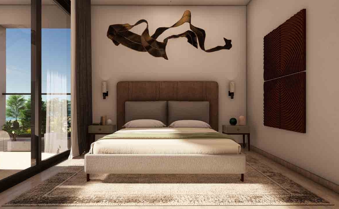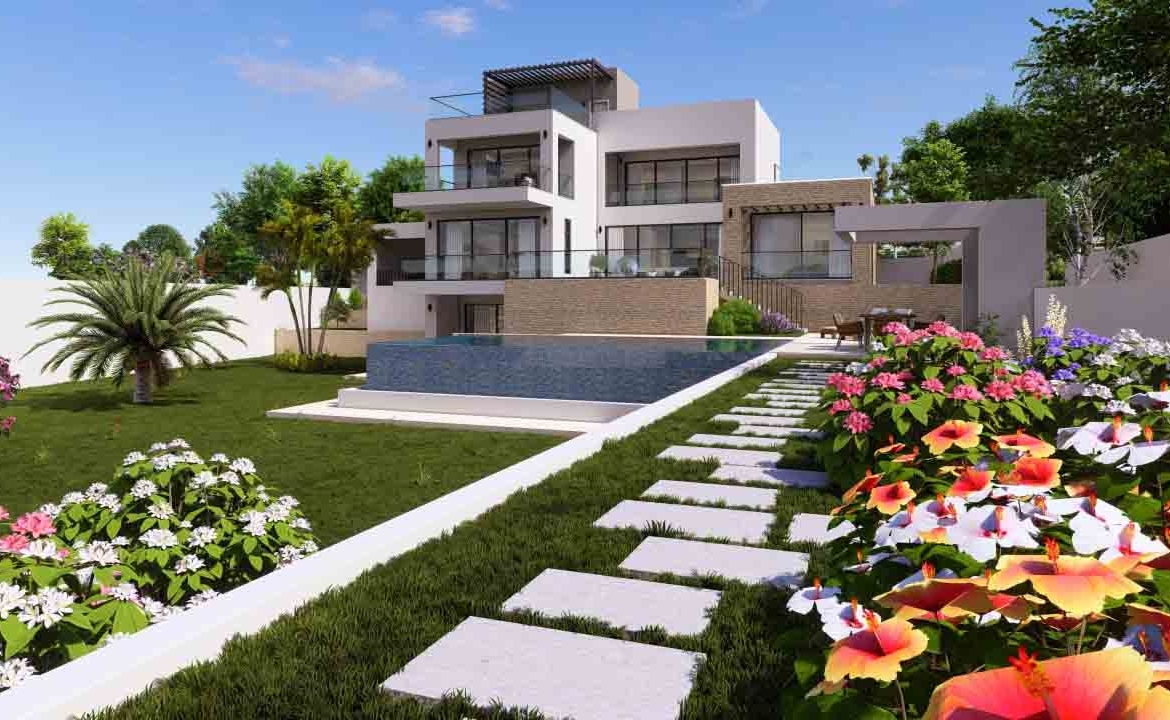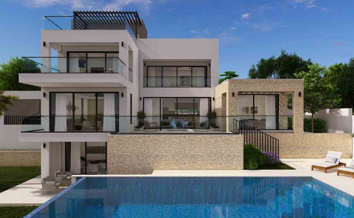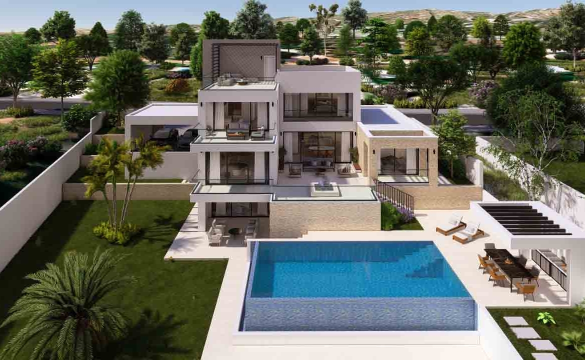 This exceptional 5-bedroom villa, set within a prestigious golf resort, spans four levels including a basement, ground floor, first floor, and roof garden. The ground floor features two bedrooms, while another bedroom is located in the basement, offering direct access to the garden and private swimming pool. Two additional bedrooms are situated on the first floor. The villa boasts a private swimming pool, outdoor barbecue area, spacious indoor and outdoor living spaces, and stunning views of the Mediterranean, the golf course, and surrounding landscapes. The design emphasizes high-quality finishes and meticulous attention to detail.